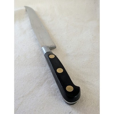 Carve into culinary excellence with this professional Sabatier chef's knife. Its sharp, durable blade glides through ingredients with precision, making meal preparation a joy. The sturdy full tang construction ensures exceptional balance and control, while the classic black handle with brass rivets offers a secure and comfortable grip for extended use. Experience the difference a quality knife makes for everyday cooking or special occasion feasts. Type: Steak Knife Number of Items in Set: 1 Material: Stainless Steel Food Compatibility: Meat, Steak Blade Edge: Straight Handle Material: Plastic Blade Length: 9 in Features: With Handles, Soft Handle Keywords: chef knife, kitchen tool, food prep, culinary, heavy duty, ergonomic handle, steak knife, carving, professional grade, French steel, ki