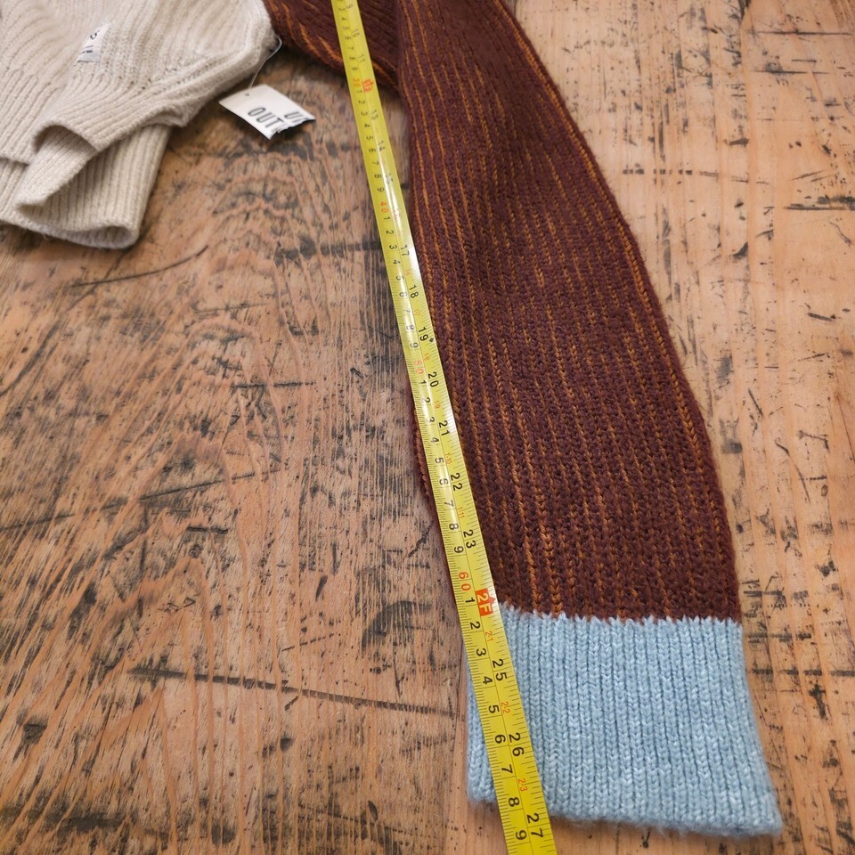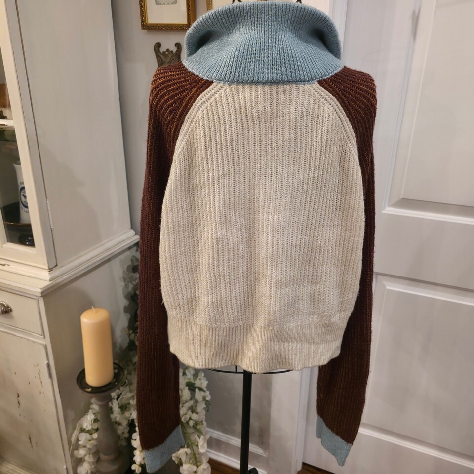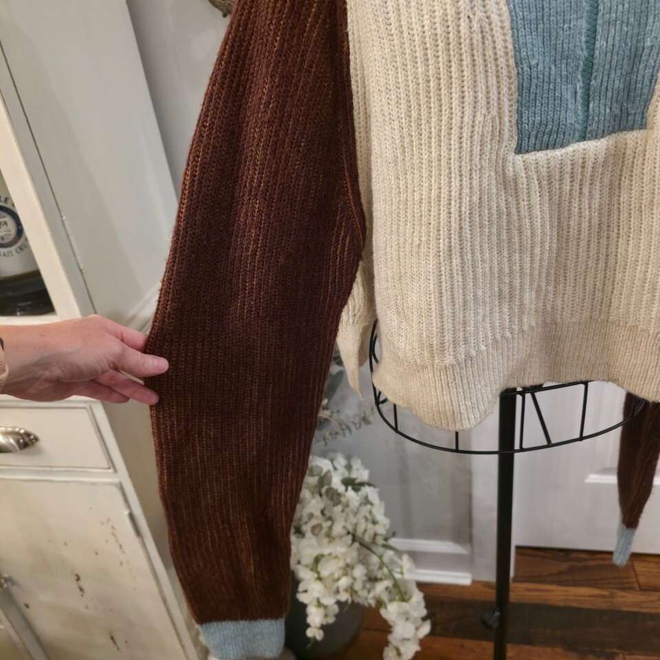 BDG Urban Outfitters colorblock half-zip sweater in soft blue, cream, and chocolate brown. Chunky ribbed knit with a relaxed, slightly cropped silhouette and funnel collar. A statement piece that merges cozy preppy energy with Y2K streetwear flair?perfect styled with denim, cargos, or mini skirts.