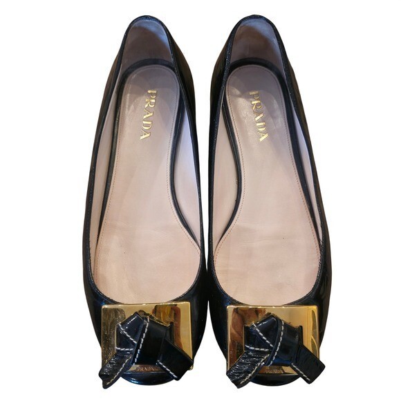 PRADA 37.5/US 7 Black Patent Leather Ballet Flats Bow Gold Luxury Minimalism
