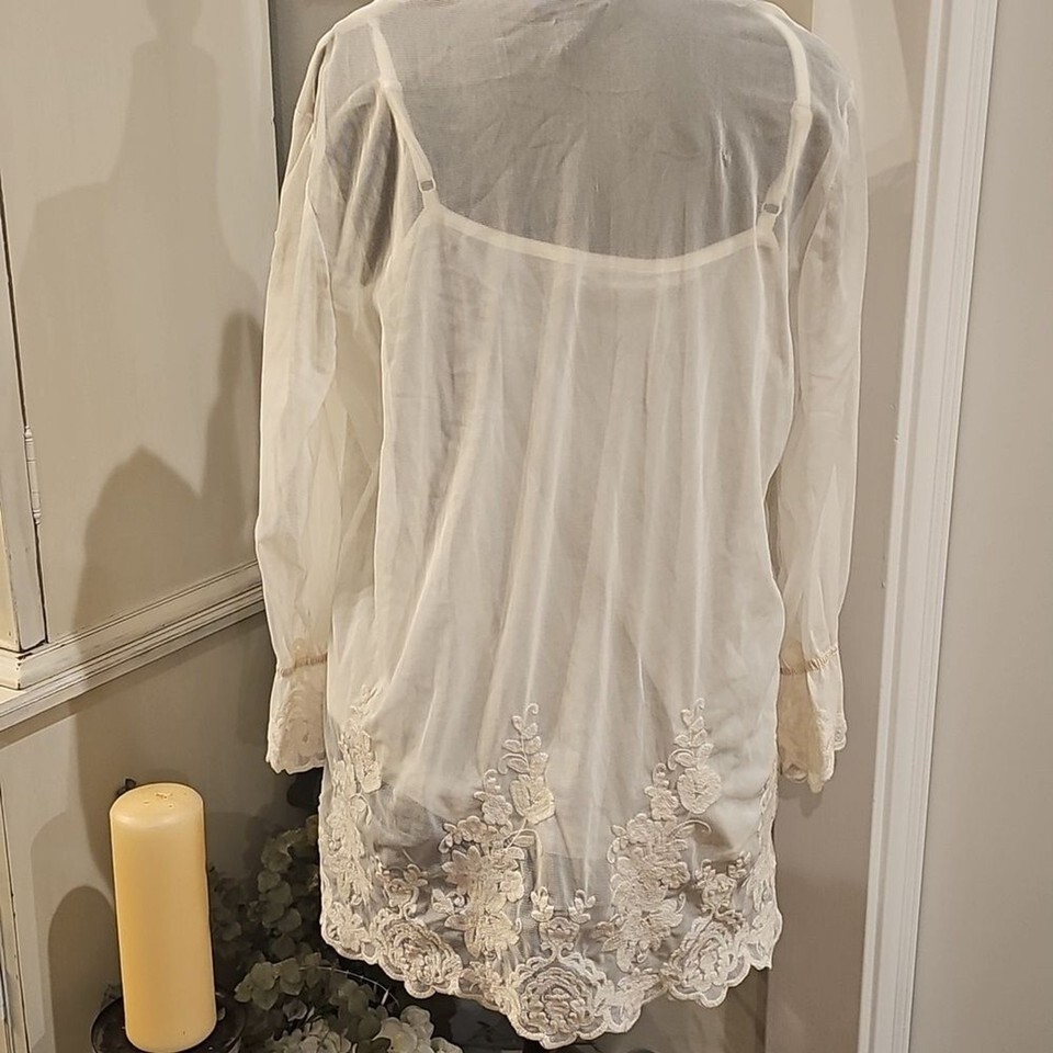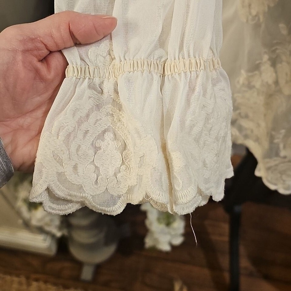 This floral off-white lace top features a split neckline with ties, gathered sleeves, and a detachable camisole.
