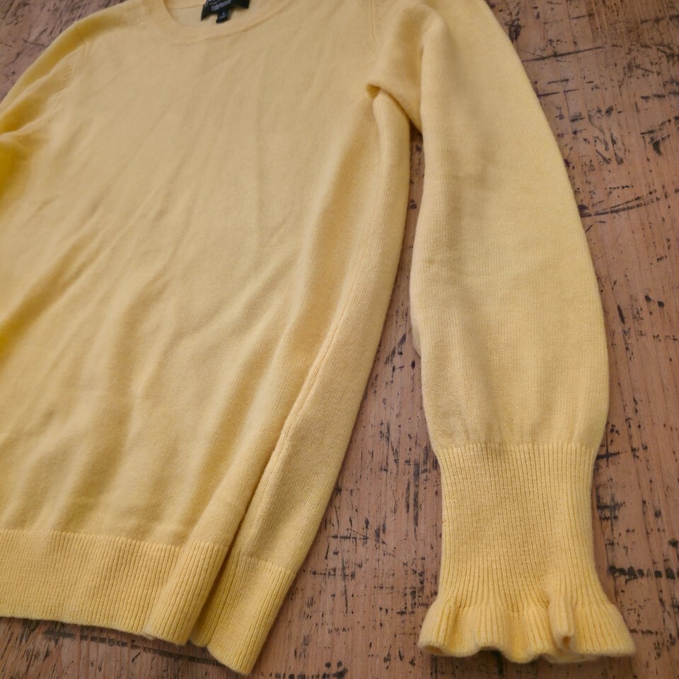 Banana Republic merino wool and cashmere-blend sweater in soft butter yellow with delicate ruffle cuffs and ribbed trim. Lightweight, smooth knit with a refined fit that layers beautifully. A versatile piece for work, brunch, or romantic coquette-inspired looks.