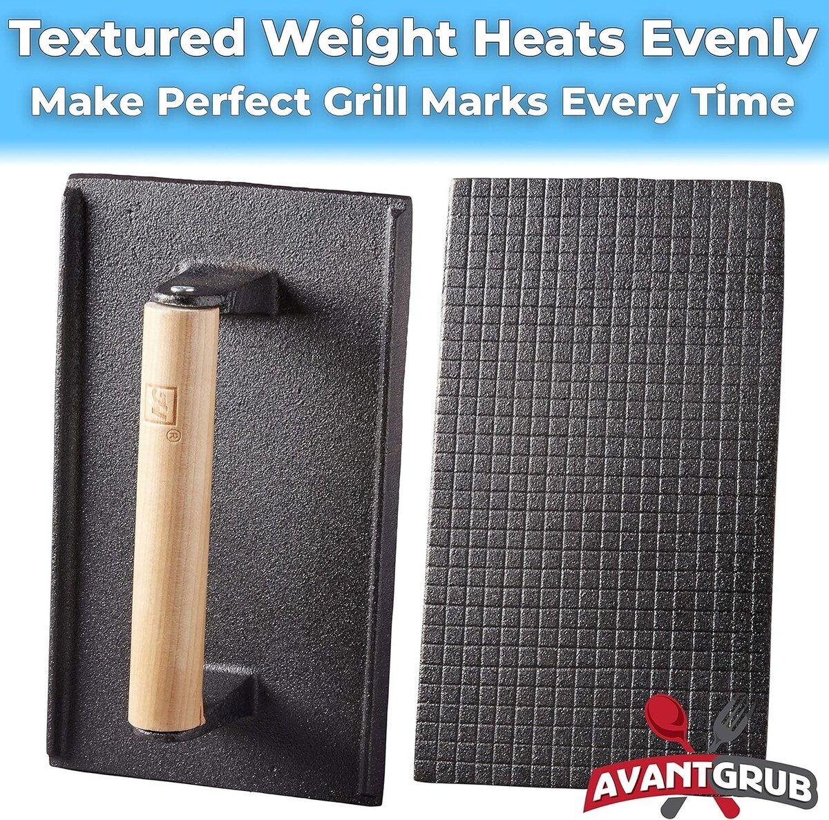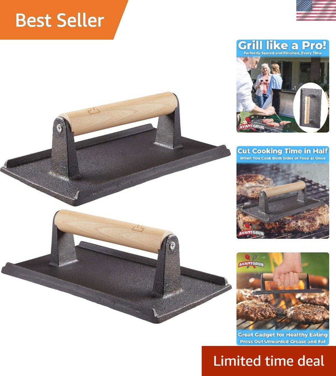 Pro Grade, Pre Seasoned Cast Iron Grill Weight 2Pk. Heavy Duty Steak and Burger Press with Wooden Handle for Grills, Griddles and Flattops. Perfect Gadget for Bacon, Paninis, Sandwiches and Vegetables