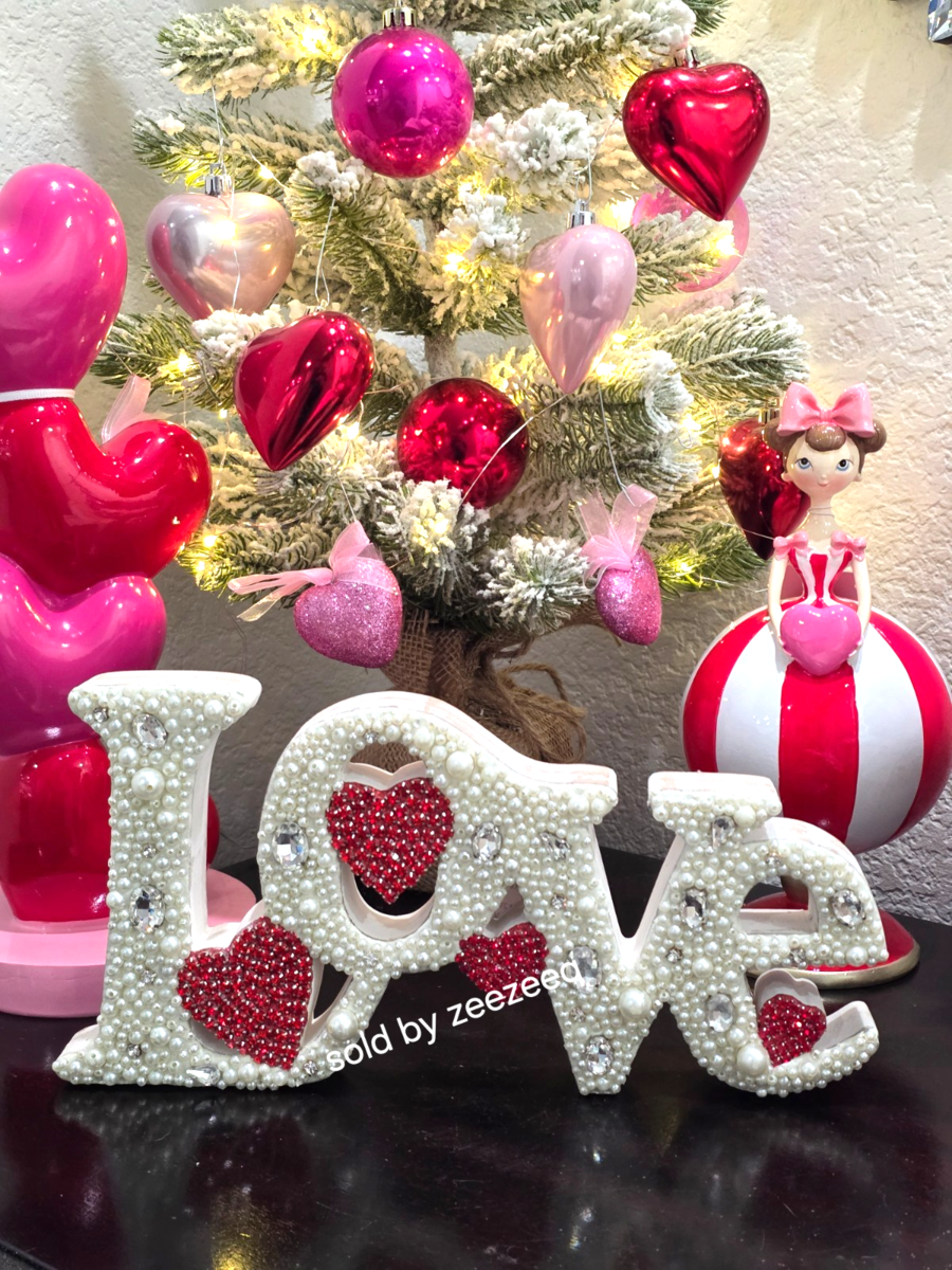 Valentines Day Faux Pearl Rhinestones Beaded Figurine Tabletop Sign 12"x6"