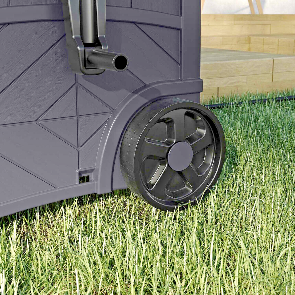 Two 7 in. wheels and a telescoping handle allow for easy transport