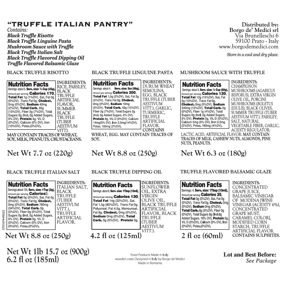 1 125 ML Black Truffle Flavored Dipping Oil (Italy) 1 180 G Black Truffle Sauce (Italy) 1 250 G Black Truffle Salt (Italy) 1 250 G Black Truffle Egg Lingine Pasta (Italy) 1 60 G Black Truffle Balsamic Glaze (Italy) 1 220 G Black Truffle Risotto (Italy)