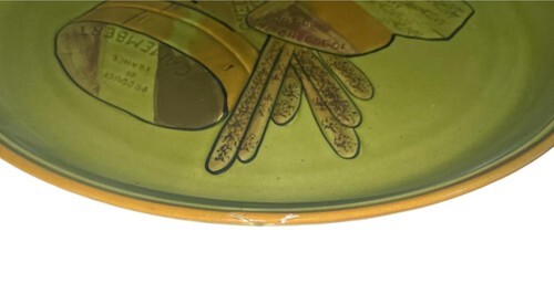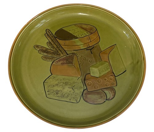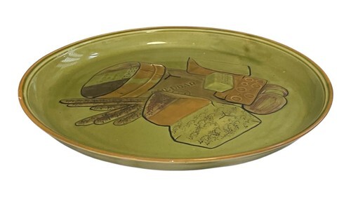 Vintage Los Angeles Potteries #505 ceramic platter featuring a cheese and bread motif on green glaze