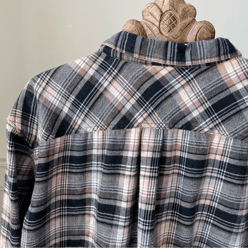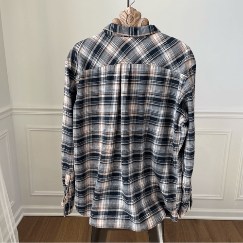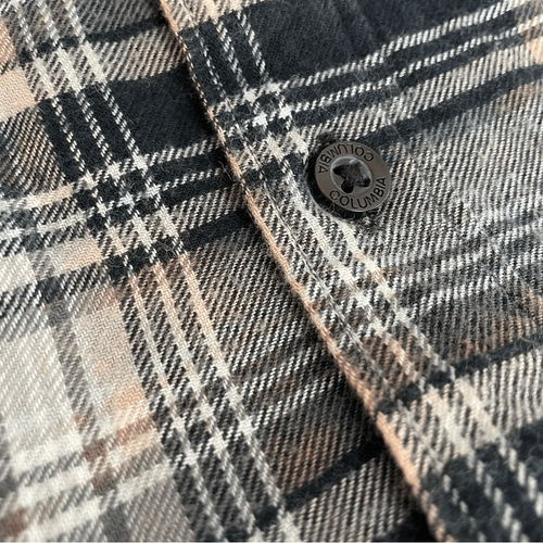 Columbia plaid flannel button down shirt made of 100% cotton. Black, salmon color, and white plaid. Button front pockets with branding tab. Laying flat measures 30 inches shoulder to hem and 27 inches armpit to armpit