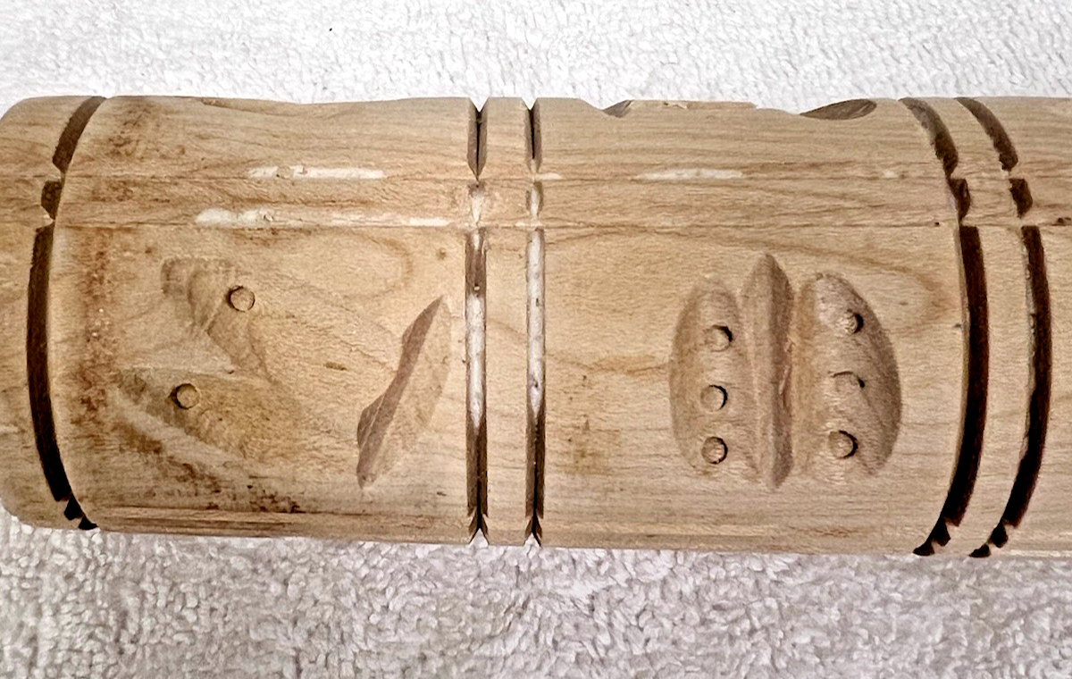 Vintage Wood Springerle Cookie Rolling Pin Embossed Bugs Butterfly Birds Fish Symbols. Springerle cookie rolling pin measures approx. 15 3/4" long, some dirtiness, no damage or signs wood rolling pin was used. See pictures.