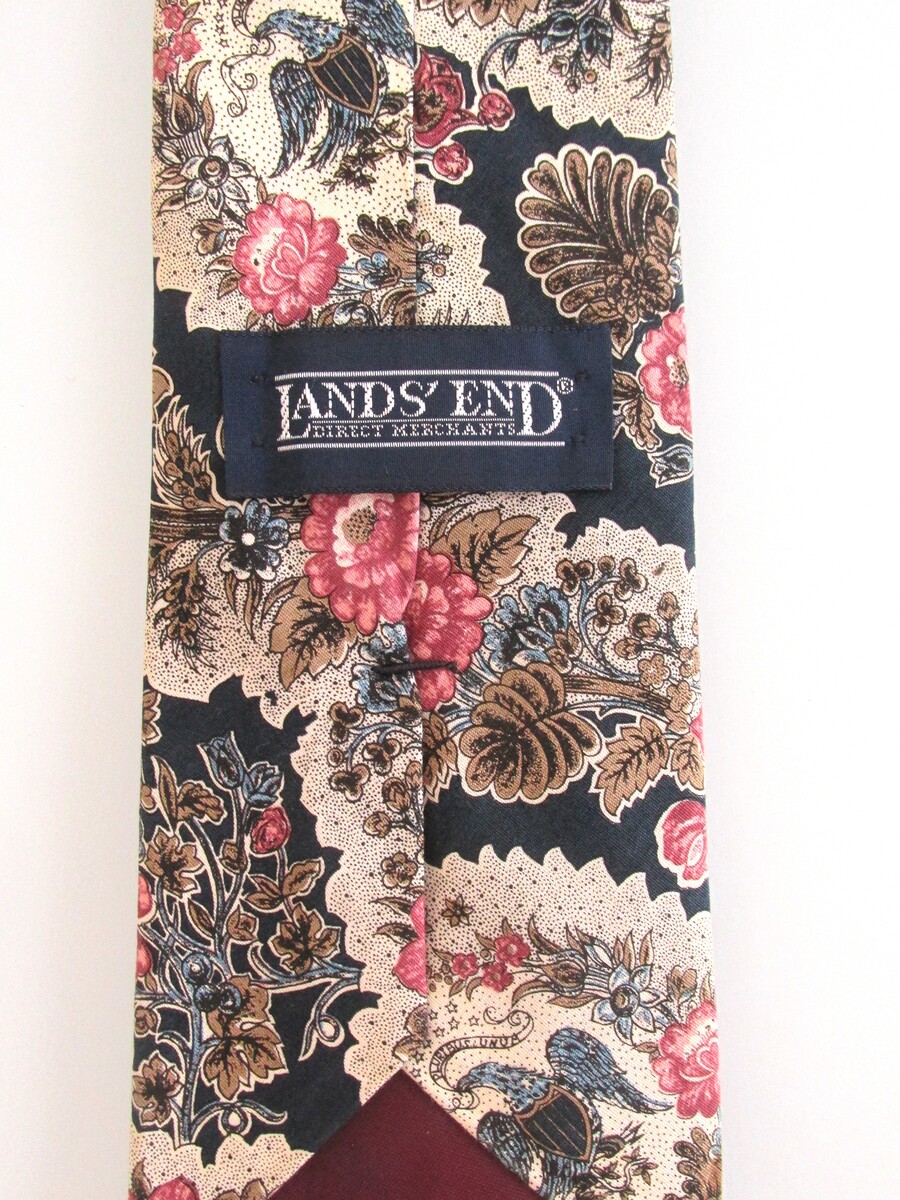 Description: Up for sale is a Lands' End men's cotton floral tie. This tie is handmade in the USA of 100% cotton. The tie has a multicolored floral pattern in pink, ivory, blue and tan on a dark navy blue background. Dimensions are approximately 56" long x 3.50" wide. This tie is in like new condition.