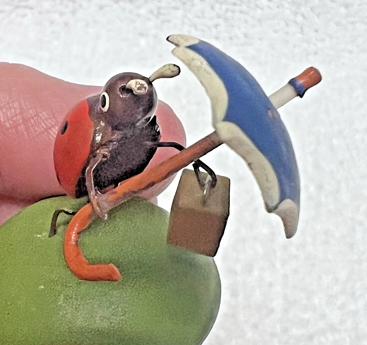 Erzgebirge Germany Vintage Ladybug with Umbrella and Suitcase in good shape the base is just shy of 1 1/4 across