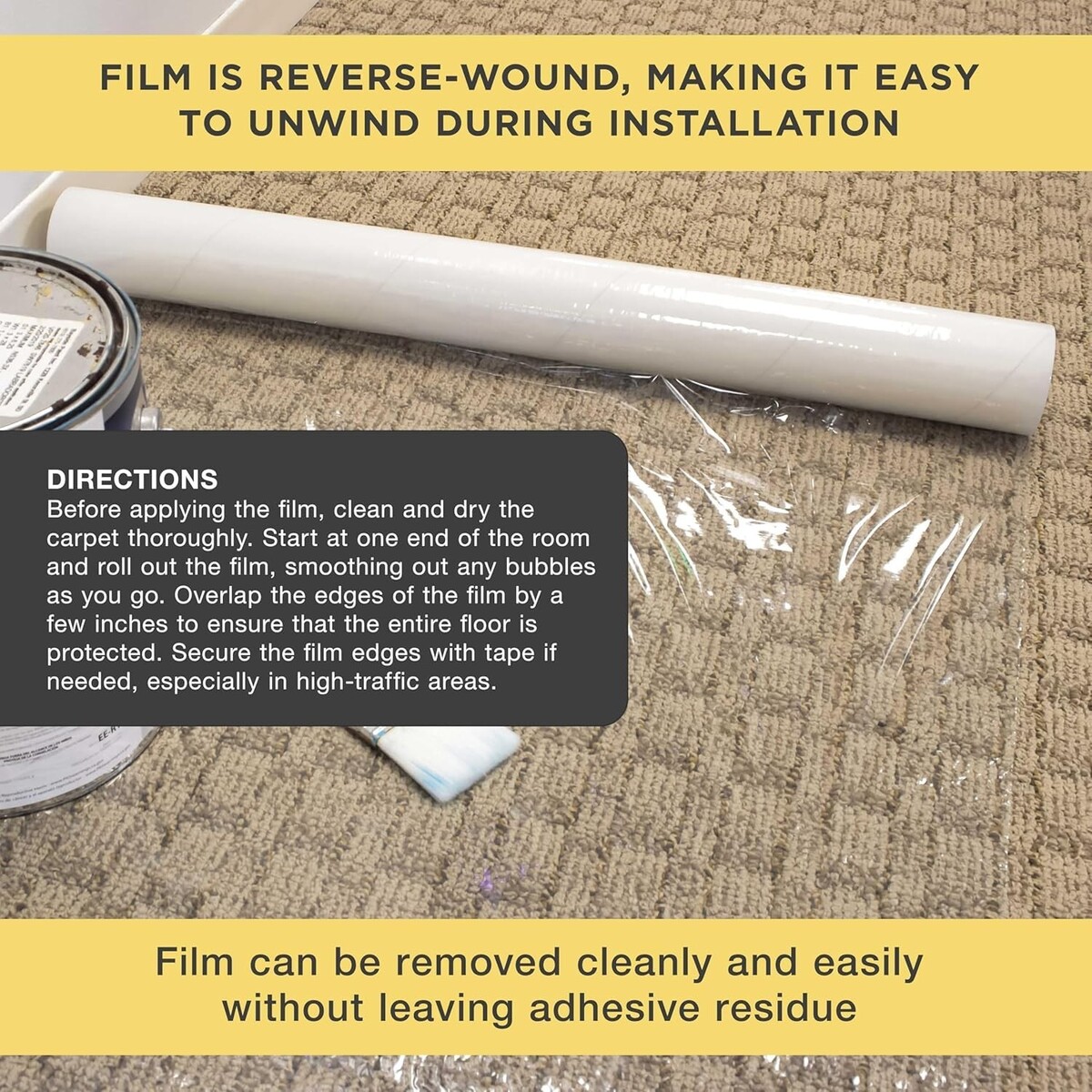 Extensive Coverage: Each 36-inch x 200-foot roll covers up to 600 square feet of carpet. This professional-grade film forms a transparent plastic cover for carpet protection. It removes cleanly and easily after use, leaving no adhesive residue.