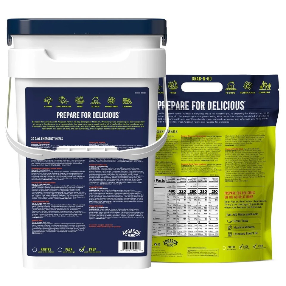 The 30-day pail is perfect for shelter-in-place scenarios, offering 1,290 calories and 36g of protein per day with 23 easy-to-prepare pouches. The 72-hour pouch is lightweight and portable, ideal for evacuation, travel, or tossing into a go-bag, with 1,580 daily calories and 58g of protein. From storms and power outages to backcountry camping, this bundle ensures you?re always ready. Meals are shelf-stable for up to 25 years, require only water to prepare, and deliver flavor, variety, and nutrition when you need it most.