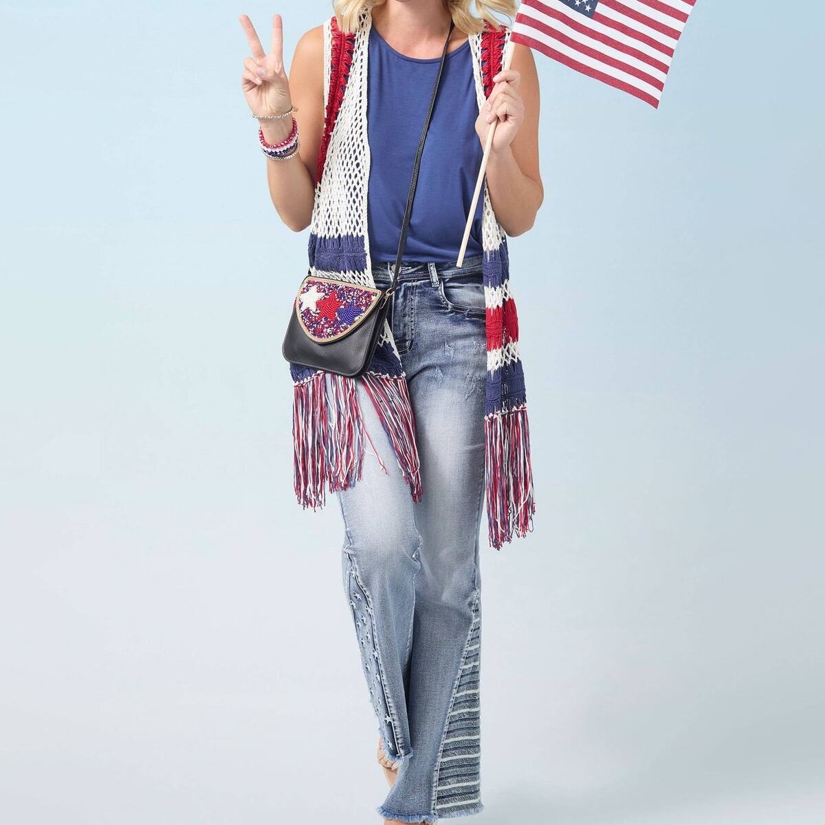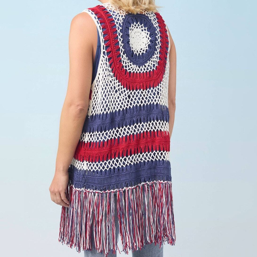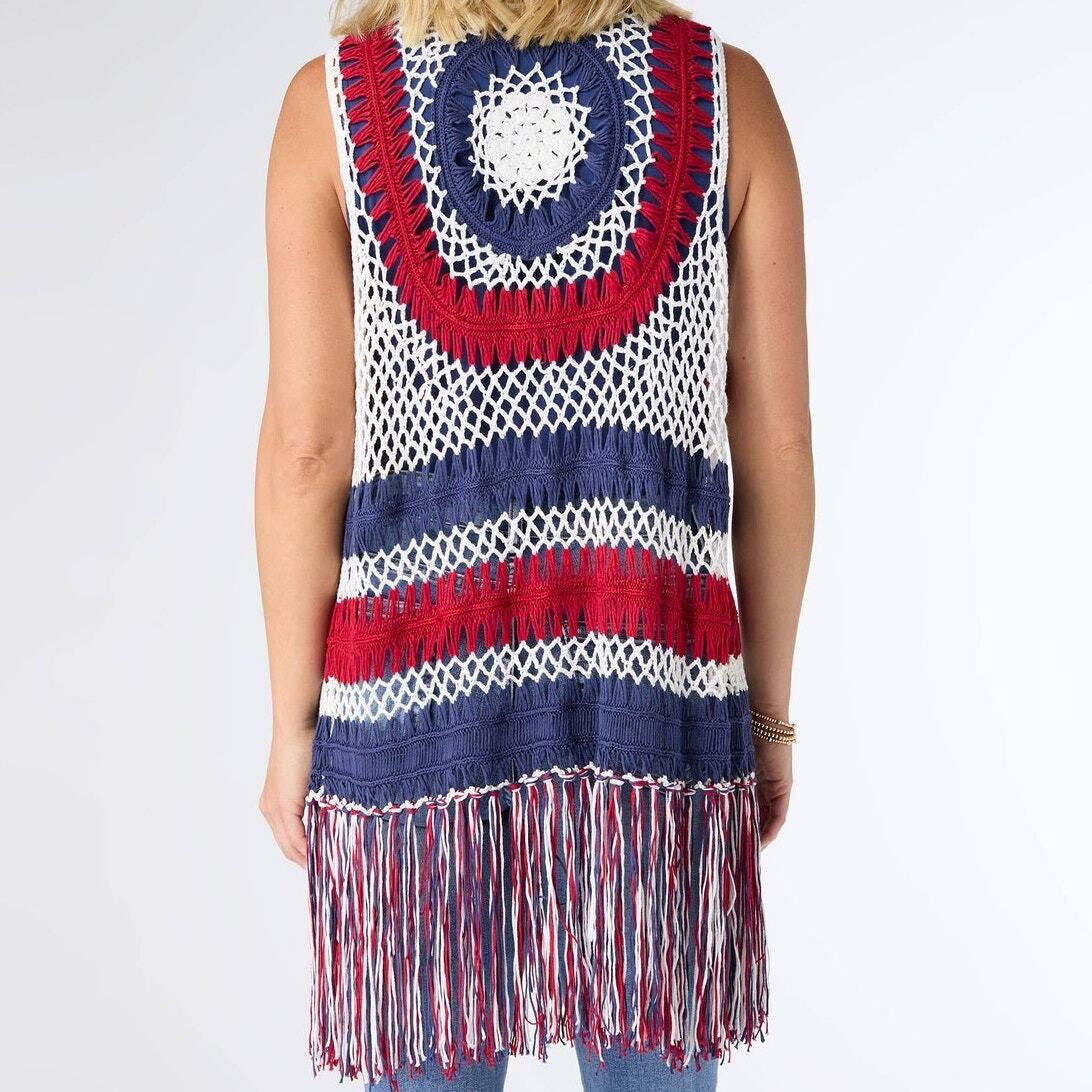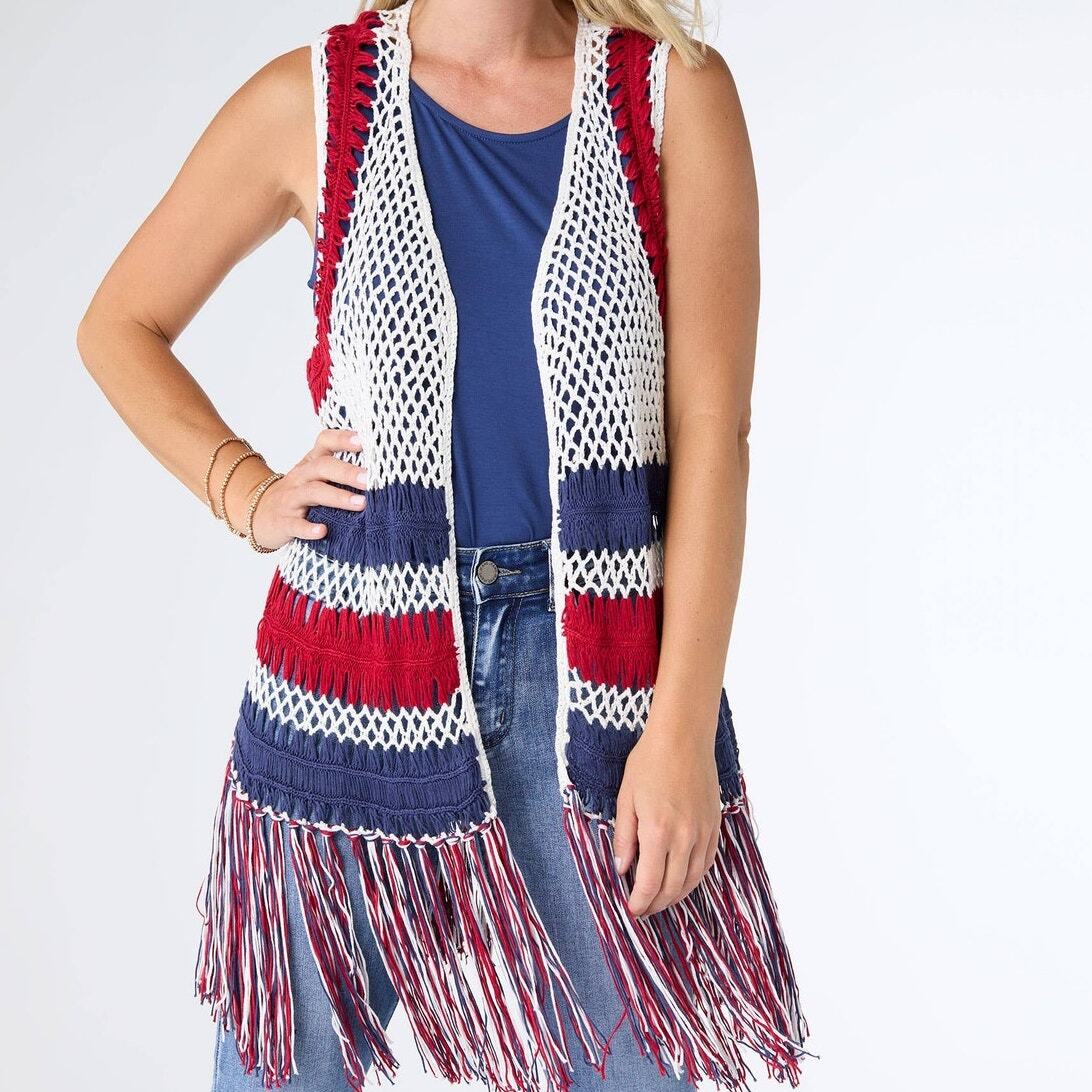 Victory Crochet Fringe Vest Americana Patriotic Red White Blue