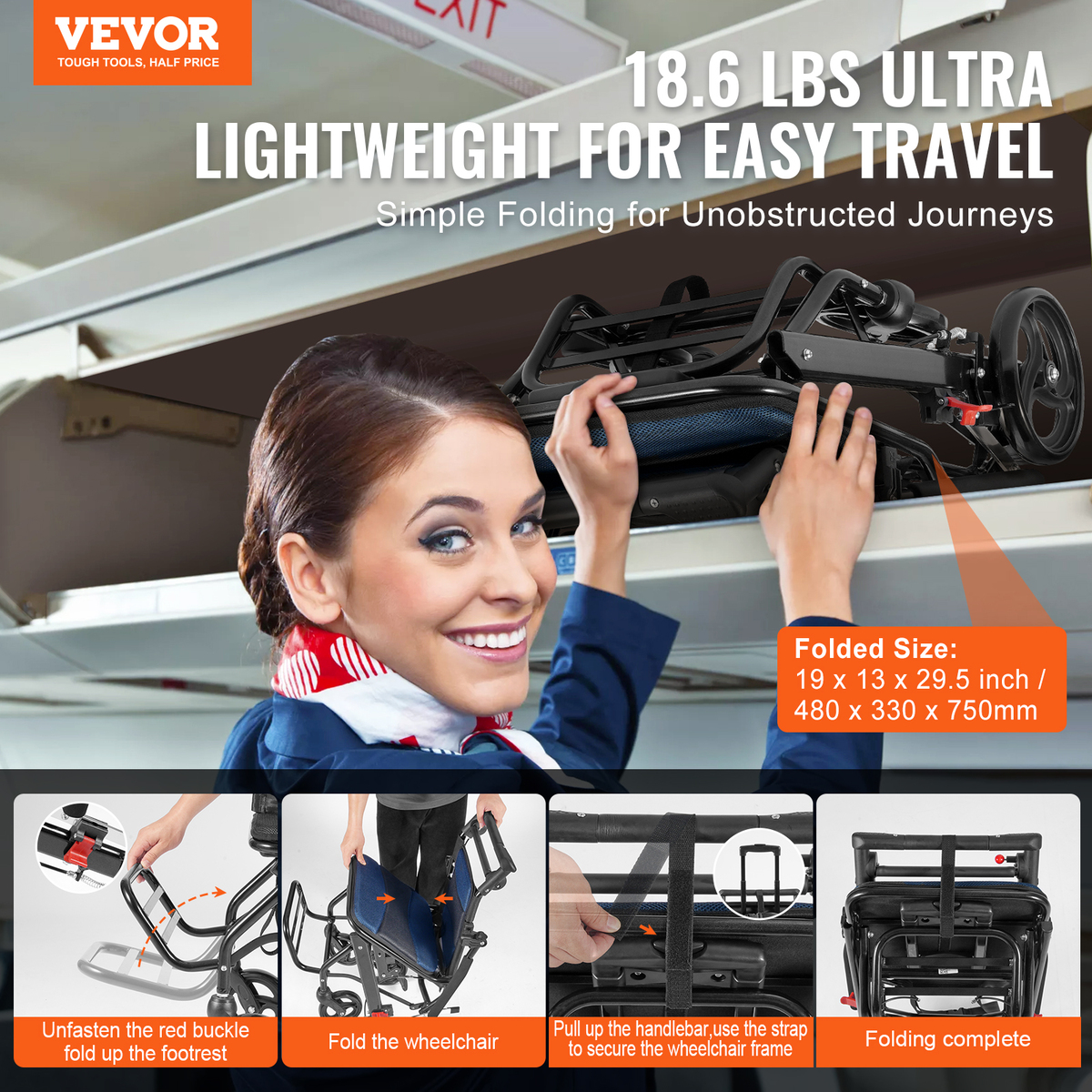 VEVOR Wheelchair, Aluminum Alloy Ultra-Lightweight, 15.75-Inch Wide Seat, 220lbs
