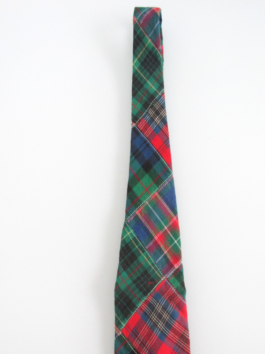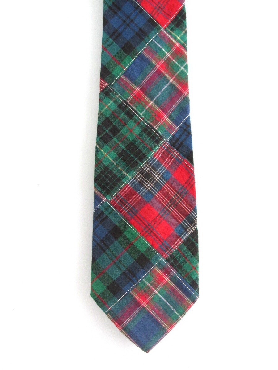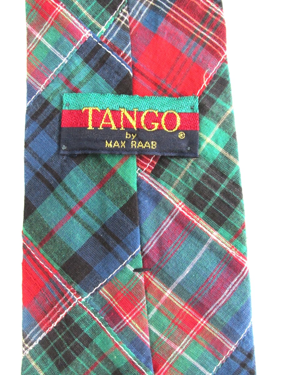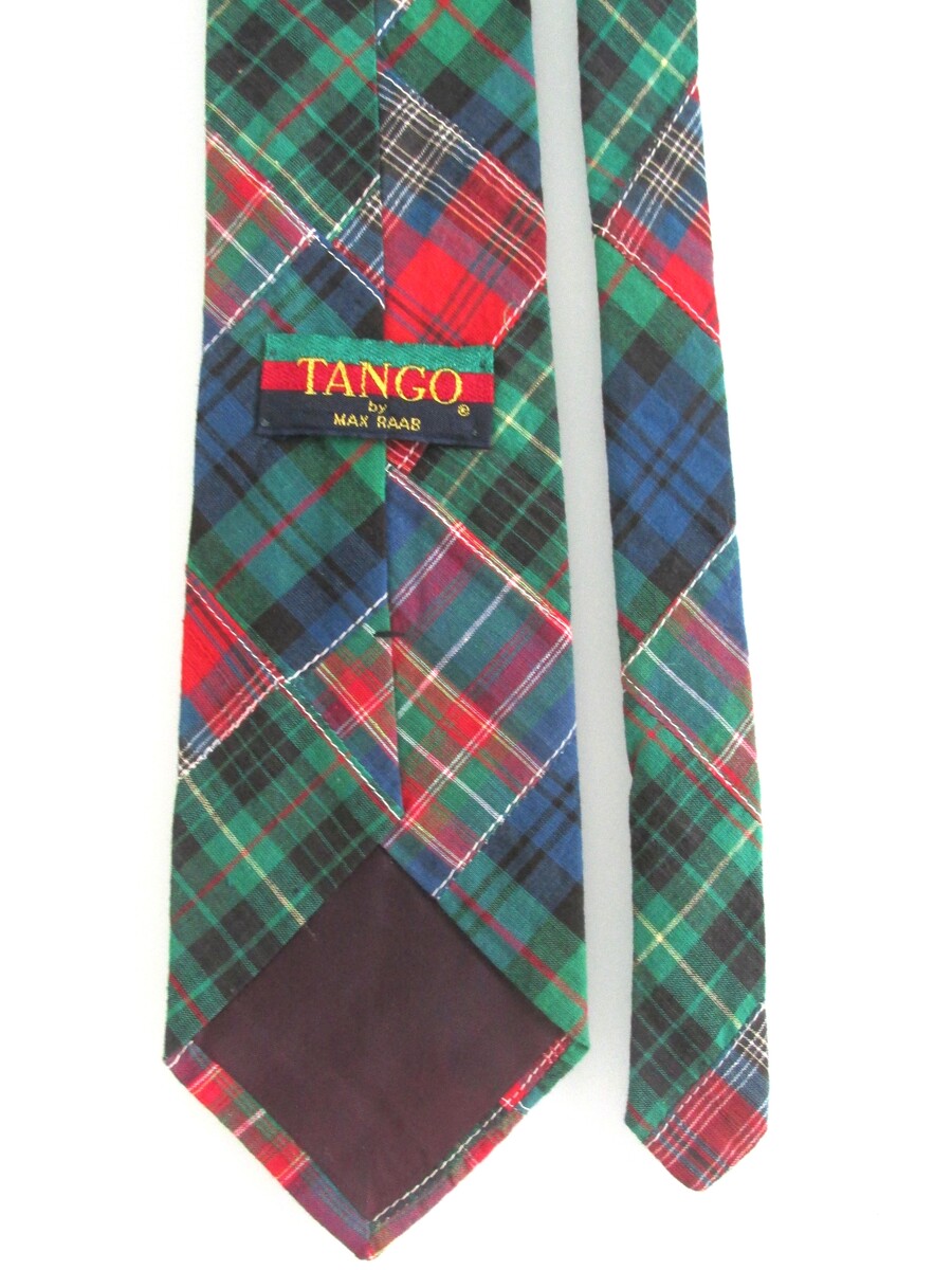 Description: Up for sale is a Tango by Max Raab vintage men's cotton plaid tie. This tie is handmade of 100% cotton. The tie has a multicolored plaid patch quilt design in green, blue, black red, green white. See photos for a more accurate depiction of colors and pattern. Dimensions are approximately 58" long x 4.00" wide. This tie is in excellent condition.