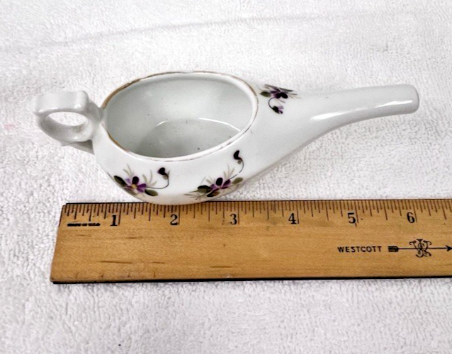 Victorian Invalid Baby Feeder w Hand Painted Violets Gold Trim 5 3/4 Inch long handle to spout. The gold trim has wear but no chips or breaks