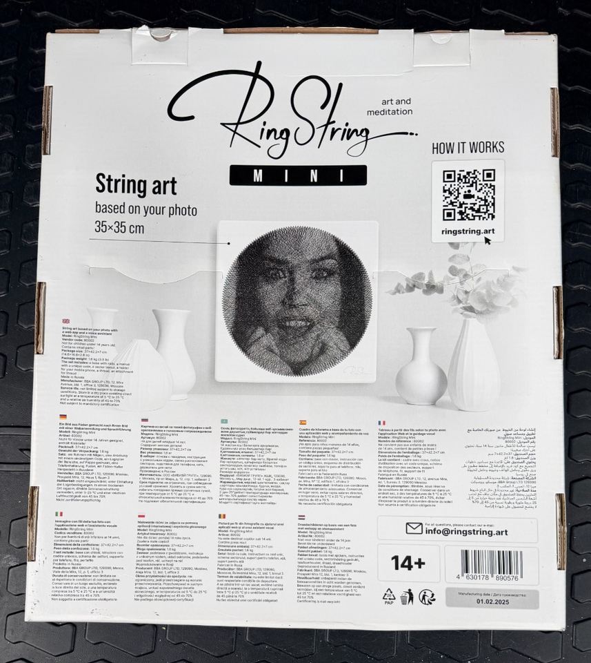Mini is a Unique String Art Kit : our crafting set helps you to transform any photo into one of a kind masterpiece. All you have to do is to order Mini kit and to follow the explicit instructions: to scan a QR-code from your box, to upload your photos and our software will show you how it will look as a string art, then you select your favorite option, and you get the step by step instructions