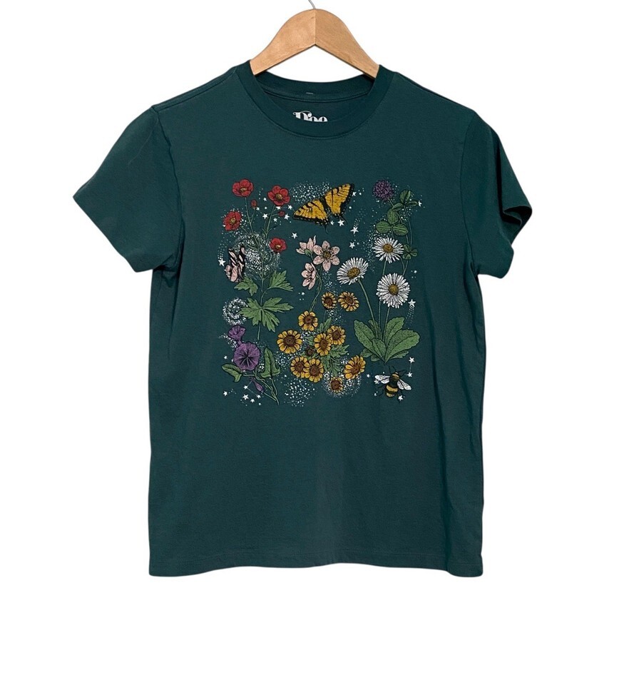 Green Floral T Shirt Gorp Core Butterfly Cotton Size Small Spring Garden Granola