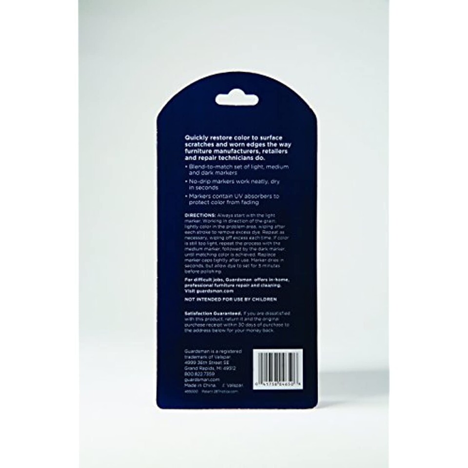 Product Description Guardsman Wood Touch-Up Markers allow you to quickly and easily conceal surface scratches and worn edges on furniture, cabinets, moldings, doors, floors, paneling, and any finished wood surfaces in your home. The 3-pack includes colors matched to the most common wood finishes, which you can mix and blend to achieve the look you want. No-drip design gives you instant results without any hassle. These markers contain UV protection for a long-lasting fix. Guardsman has been a leader in furniture care since 1915, delivering quality products and services for the protection, care, and repair of wood, fabric, and leather furnishings and bedding products. Backed by the strength of the Guardsman Corporation, the worlds largest supplier of wood finishes to the furniture and cabinet industry, Guardsman products include polishes and cleaners for fine wood, leather, and fabric furniture, as well as a complete line of furniture maintenance products for touch-up, repair and spot cleaning. Guardsman is also a leading provider of furniture repairs services. We visit hundreds of thousands of homes every year to successfully repair furnitureso you know our products work! With nearly a century of expertise in the furniture care business, Guardsman is an established, secure, and committed partner in maintaining the beauty and extending the life of your furniture. From the Manufacturer Guardsman Brown Wood Finish Touch- Up Markers in Shelf-Tray. Trusted by furniture professionals, Guardsman Wood Repair Touch-Up Markers provide scratch repair that instantly and easily conceal surface scratches and worn edges to maintain wood's beauty. Containing three markers for light, medium and dark brown wood finishes, our markers repair the finish of your wood and are blendable to help you find the shade you need. Recommended by furniture makers, Guardsman is excellence in furniture care since 1915.