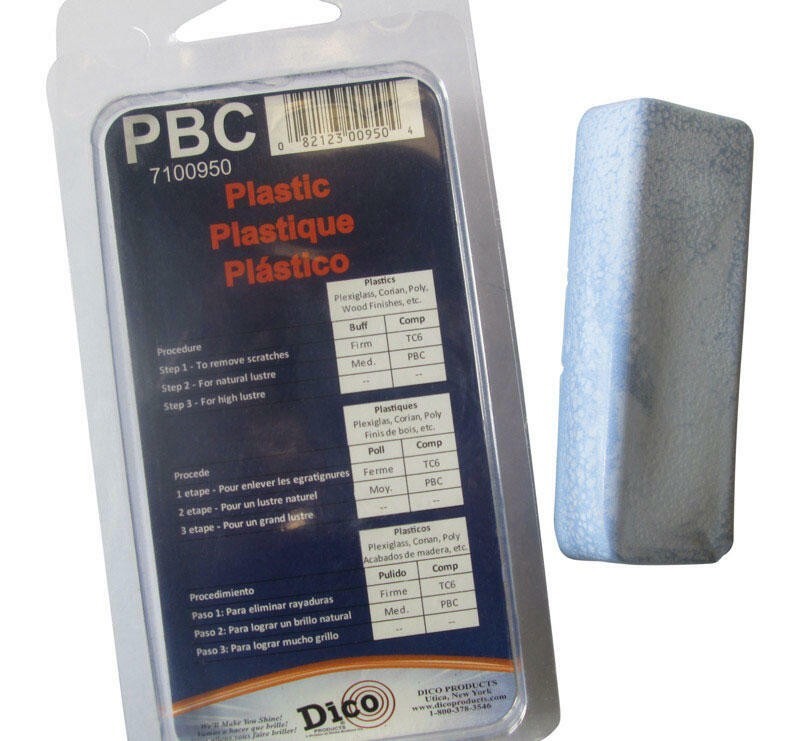 PBC plastic rouge buffing compound excellent for edge finishing of acrylic sheeting and restoring a clean finish to solid plastics. Removes scratches and produces a brilliant high-gloss finish. For final step, crystal clear or high gloss finish on acrylics, Plexiglas other hard plastics. Solid in form, unlimited shelf life. Generally used with a cushion sewn buffing wheel.