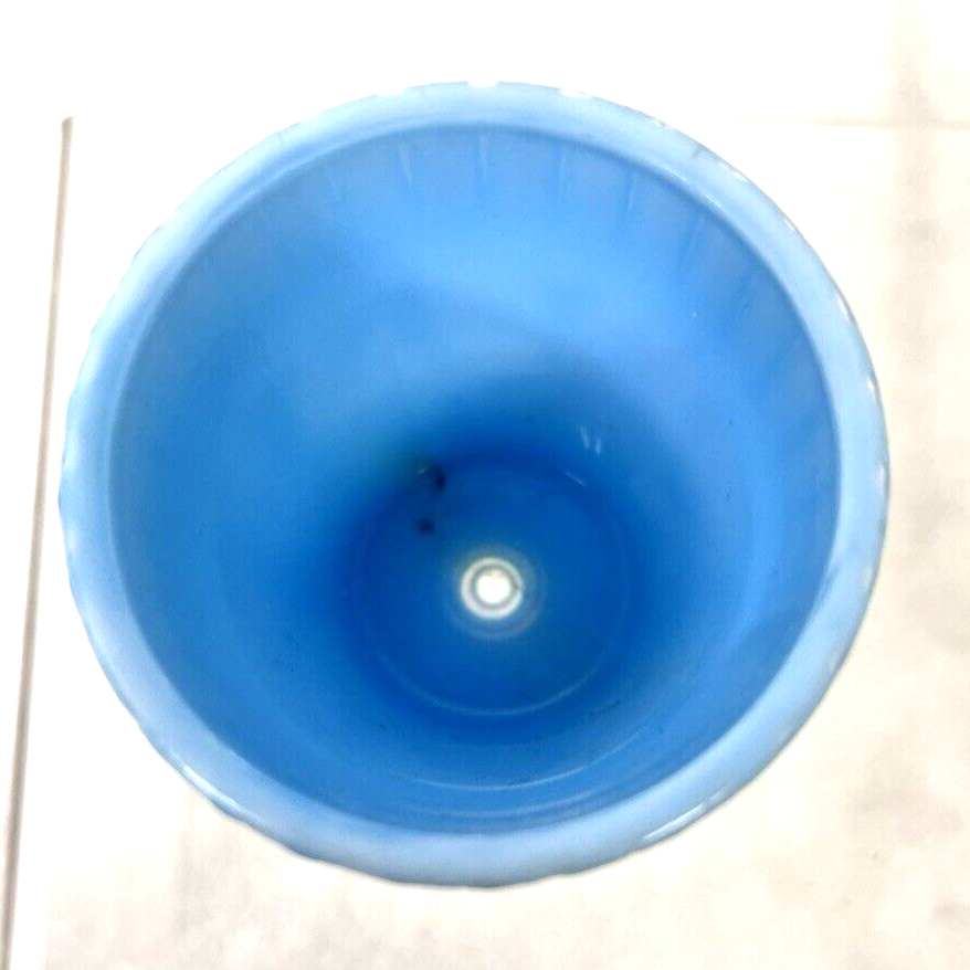 Vintage Acro Agate Light Robins Egg Blue Glass Windowsill Flowerpot 2 1/4 Tall and 2 1/4 wide at the top bottom is 1 3/8 it has a streak of yellow and a dark blue spot in the mix of light blue and white glass