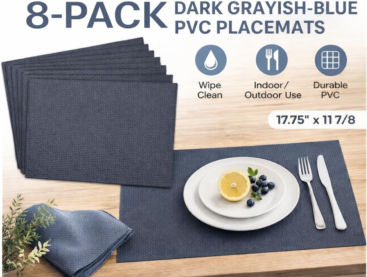 This listing includes a set of eight rectangular PVC placemats in a charcoal blue-gray color. Designed for everyday table use, these placemats help protect table surfaces from spills, scratches, and heat.