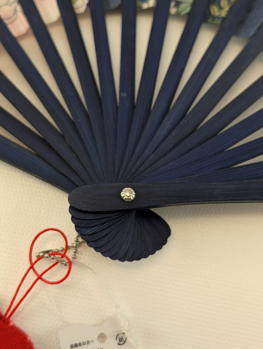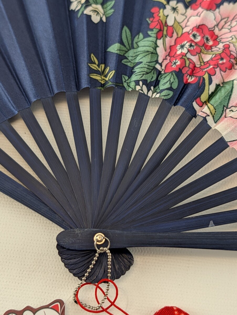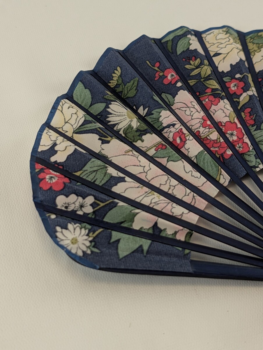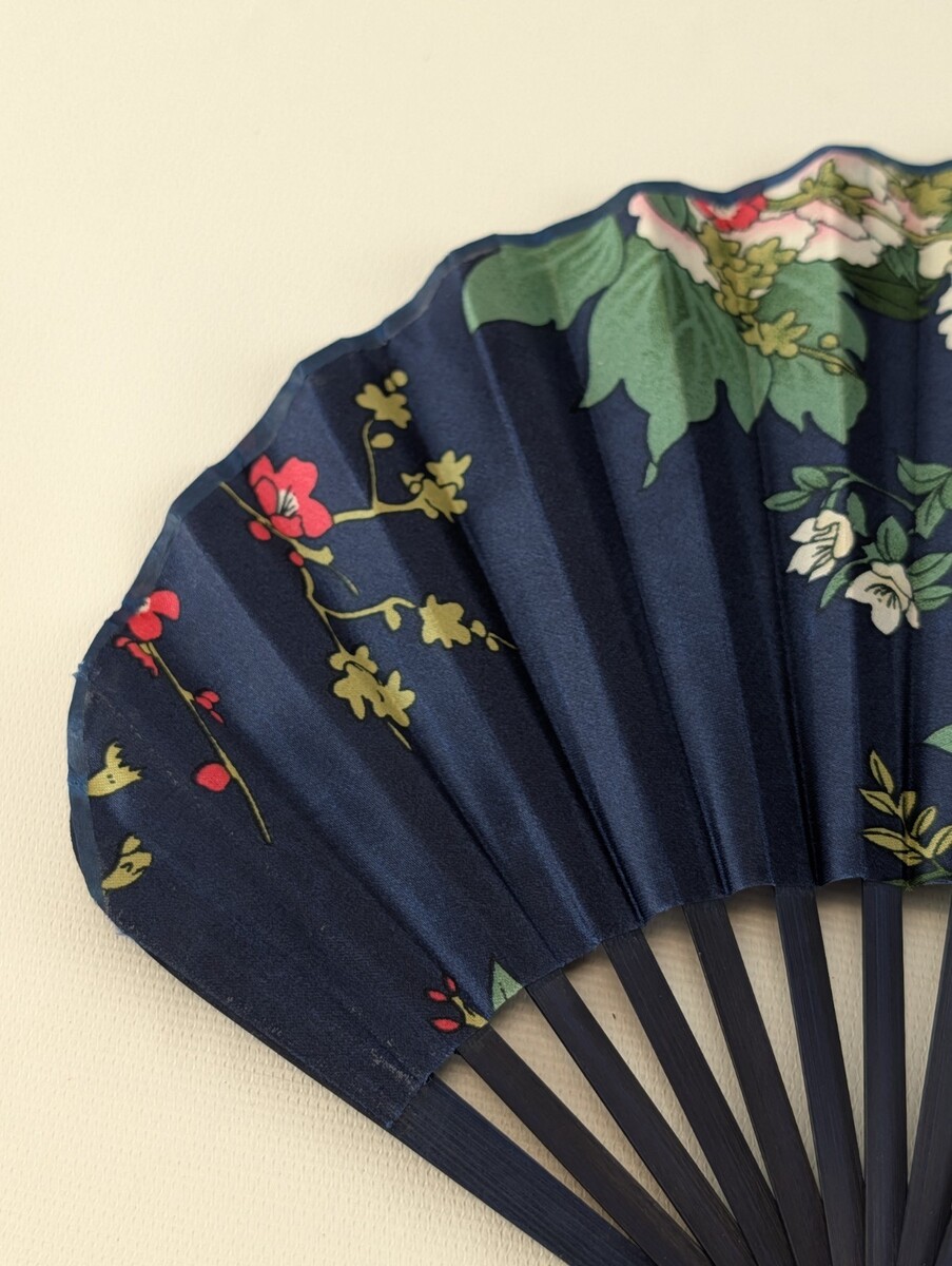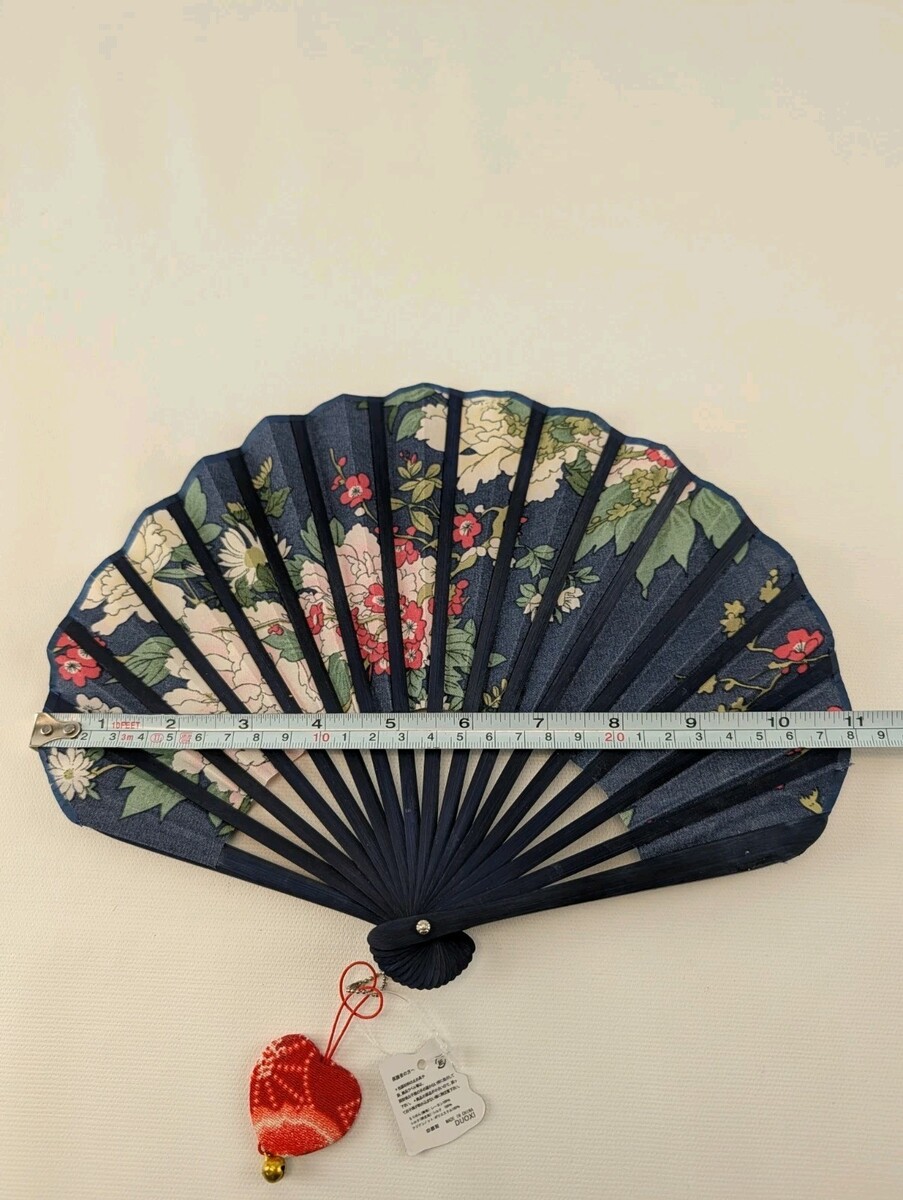 Japanese Sensu Folding Fan Navy Blue Silk Rayon Chirimen Floral Heart Charm