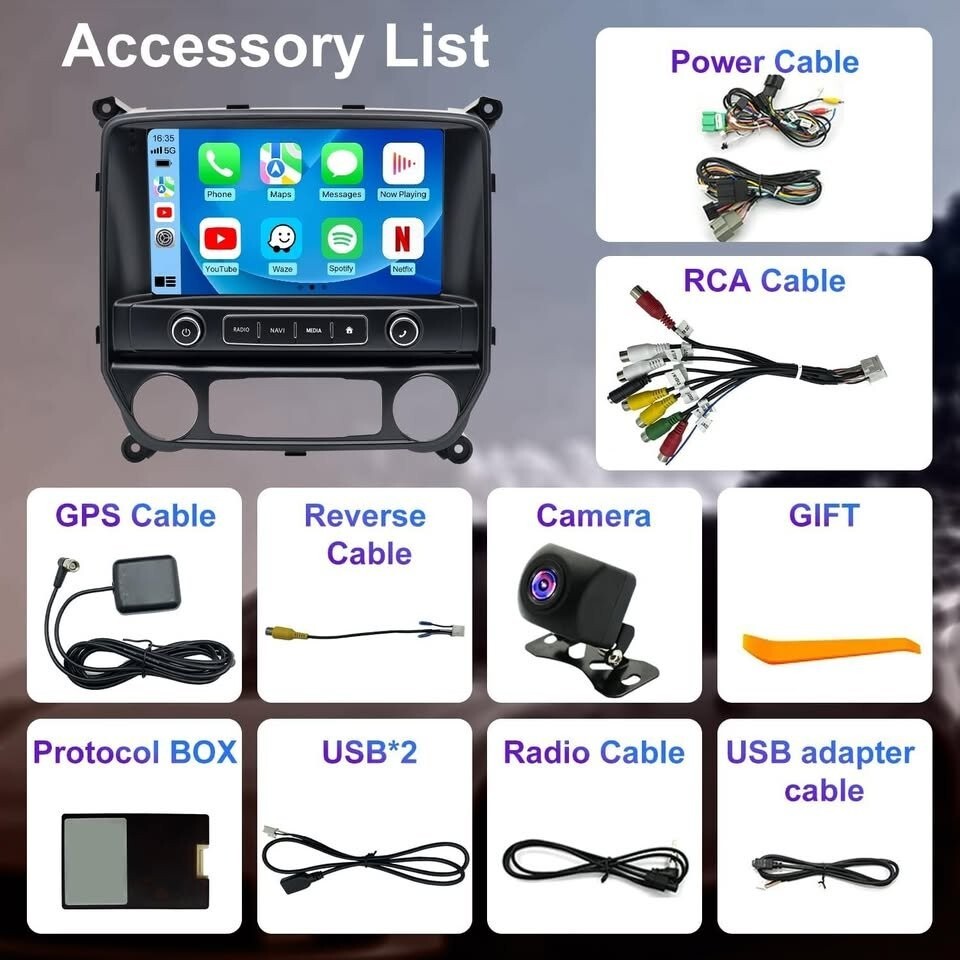 ? Included Components: Chevy Silverado GMC Sierra 1500/2500/3500 radio head unit, Canbus box, harness cable, GPS antenna, backup camera, installation instructions, user manual?