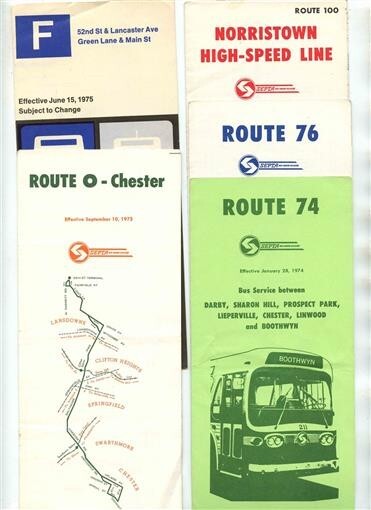 5 different Southeastern Pennsylvania Transportation Authority SEPTA Time Tables from the 1970's Includes Route O Chester, Route 74, Route 76, Route 100 and Route F. Dated 1973, 1974 and 1975.