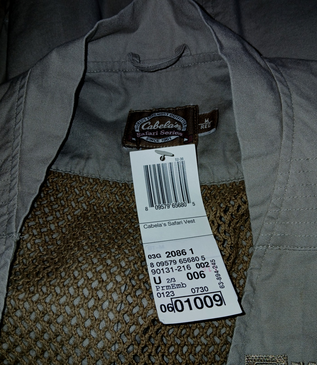 THIS IS A NICE MEN'S CABELA'S SAFARI SERIES VEST IN A SIZE MEDIUM. IT IS NEW, WITH TAGS ATTACHED BUT HAS THE COMPANY NAME EMBROIDERED AS MENTIONED ABOVE.