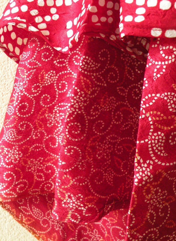 A luxurious blend of one of kind colors and prints enriched by a unique patterns. These beautiful 2 layers versatile vintage silk wraps offer an array of possibilities for over 100 ways to wear. You can achieve any number of looks from simple to sophisticated in skirt, dress, top, sarong, sari style, poncho or shawl.