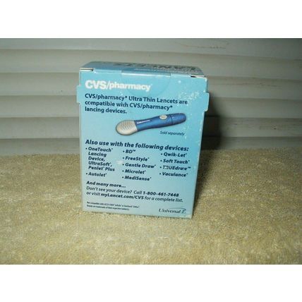 cvs ultra thin lancets for sensitive fingers....1 box of 100 sealed 30 gauge.......not compatible with accu-chek softclix or onetouch delica lancing devices.......for use with cvs pharmacy lancing devices.....also.........onetouch, ultrasoft, penlet plus, autolet,bd, freestyle, gentle draw, microlet, medisense, qwik-let, soft touch, true draw, vaculance.........box has marks etc but is firmly sealed..........this item does not have an exp date on the box..........older stock