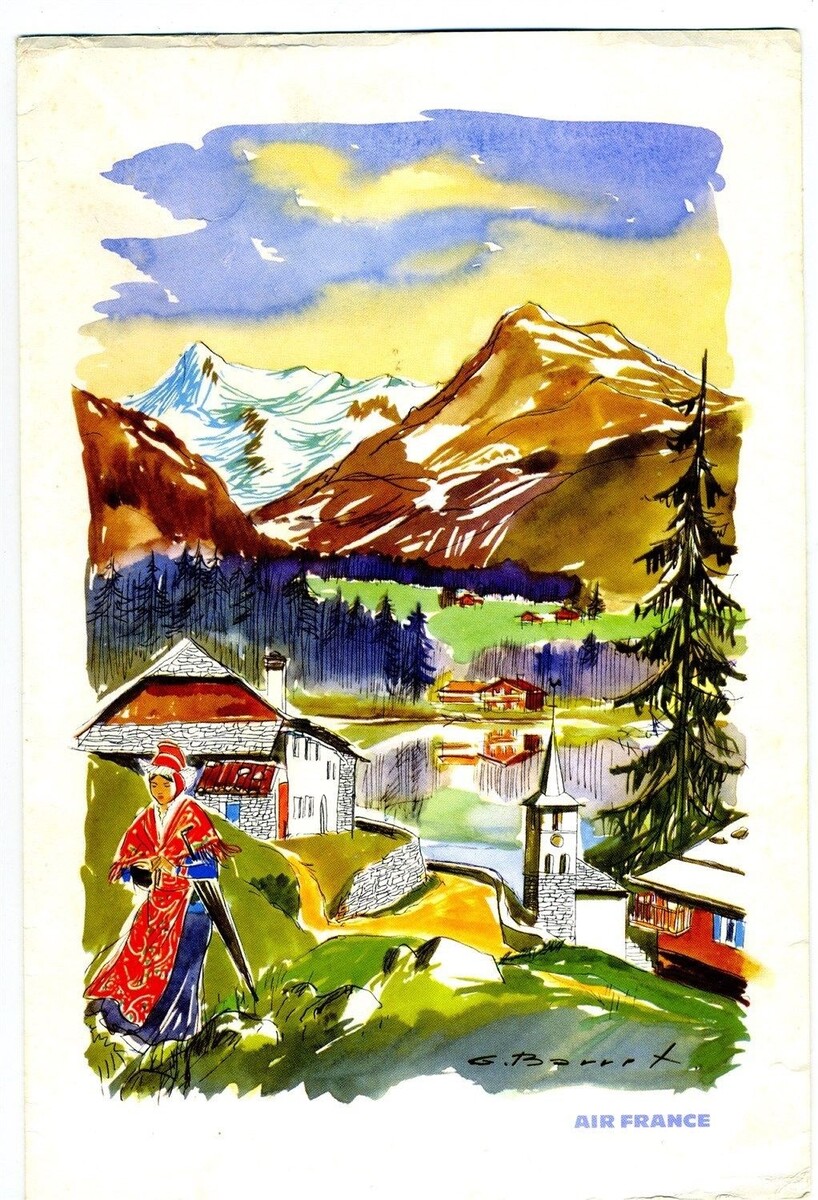 An Air France Menu from a flight from to Paris to New York to Mexico in 1962 on a Boeing Jet Intercontinental. From the collection of a retired American Airlines Employee. In very good condition with edge wear. Measures about 6 1/8" x 9 1/8" when closed. Has a colorful drawing by G Barret on the front cover.