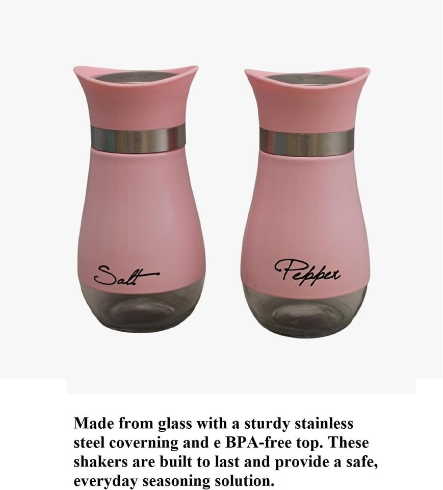 This salt and pepper shaker set is designed for everyday kitchen and dining use. The set features BPA-free glass shakers with stainless steel tops and clearly printed ?Salt? and ?Pepper? labels for quick identification during cooking or table service.