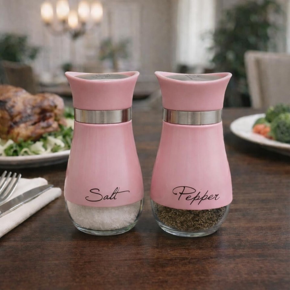 Salt Pepper Shaker Set Glass w/ Printed Labels 4.42 oz BPA-Free Pink