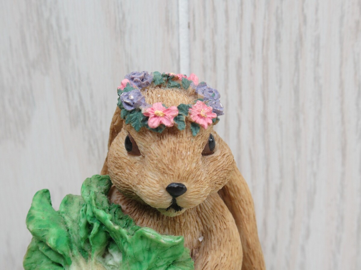 Bunny figure brown standing long lop eared floral crown cabbage basket figurine