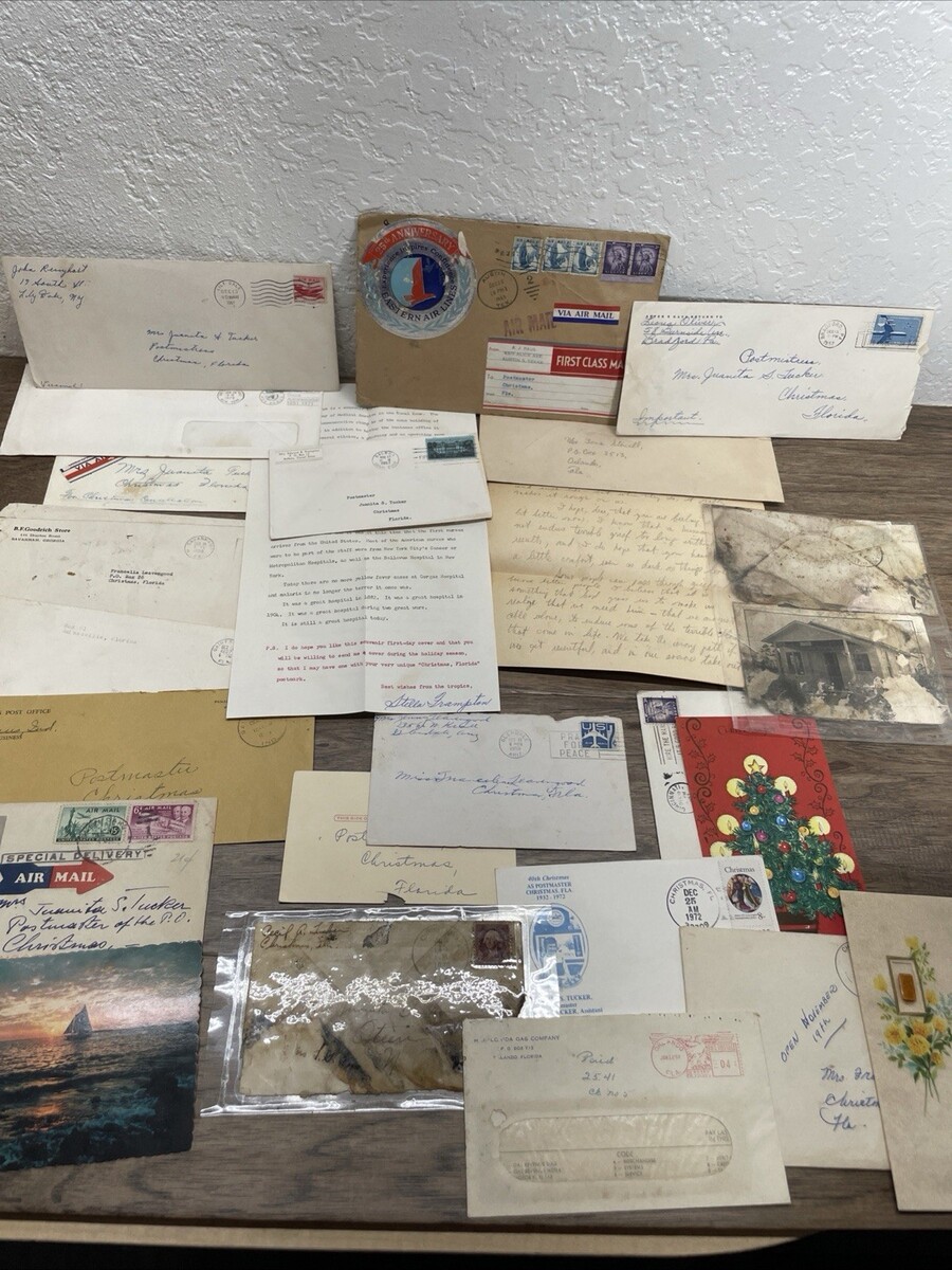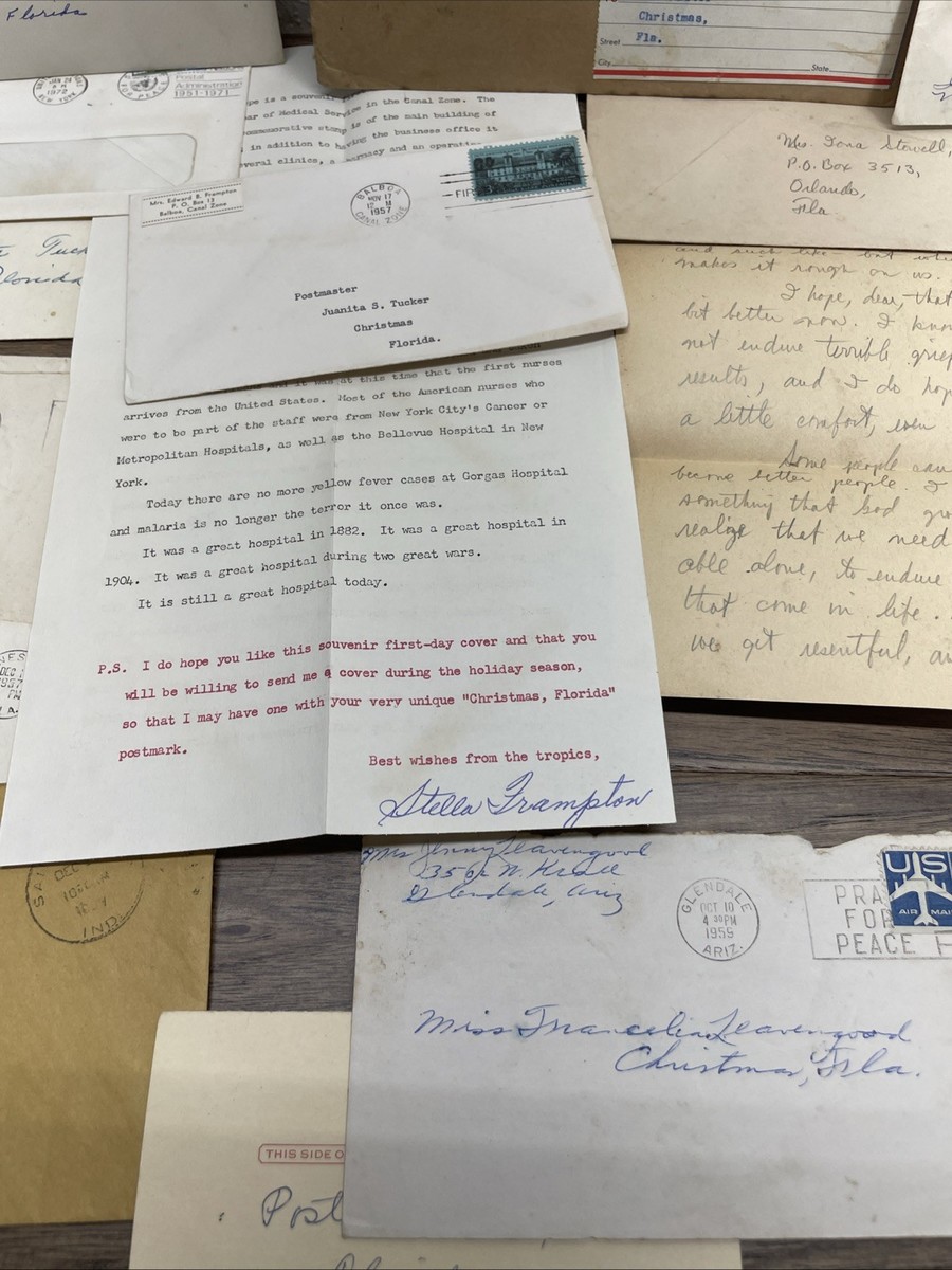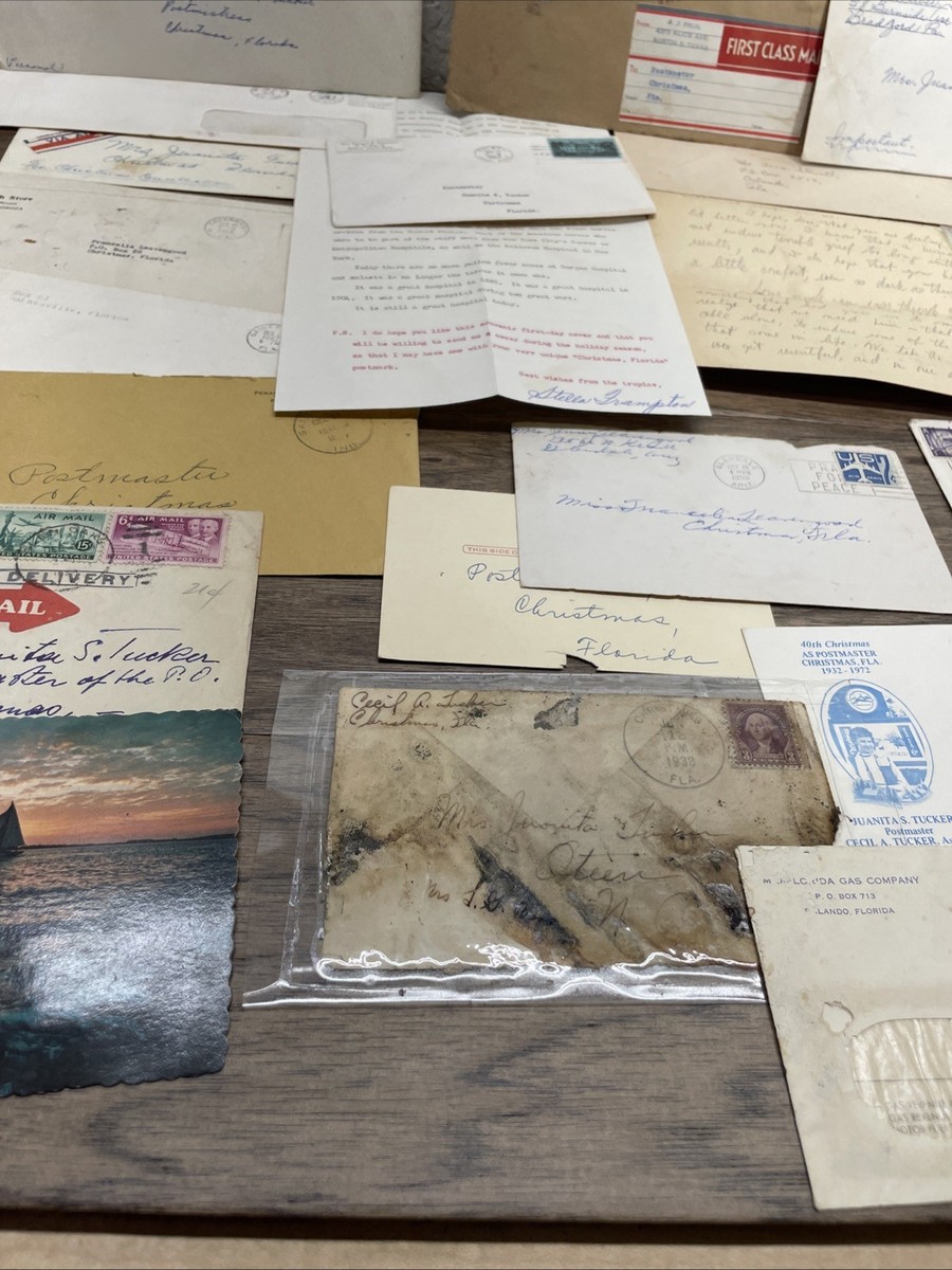 Beautiful and unique one of a kind paper ephemera mail lot. Most are addressed to Christmas Florida, but the postmarks are from all over. These are mostly addressed to the postmaster, but do have other addressees. Perfect lot for a first time collector. Paper is yellowed due to age and storage, as well as frayed and torn in places. This lot includes Christmas cards, letters, and envelopes, dating from the 1930's to the 1990's. Please see pictures for condition details and measurements.
