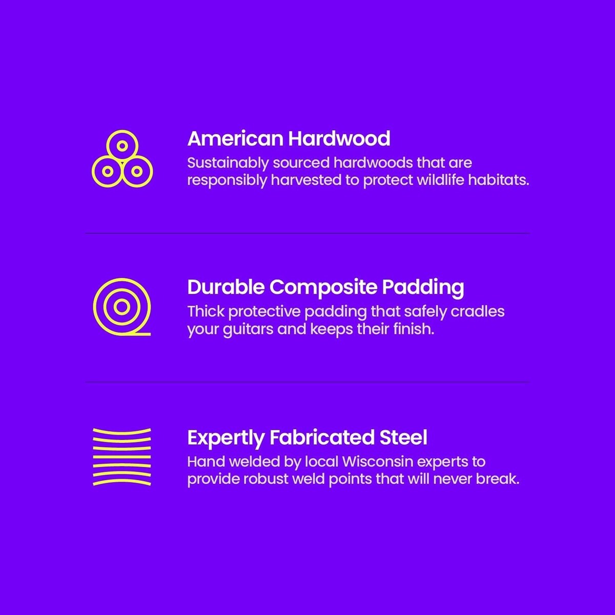 LOCALLY SOURCED HARDWOODS: Our wall mount guitar hanger is Made in the USA with sustainably sourced North American black walnut hardwood which provides durability as well as a crisp look to your room/studio. Confidently place your instruments on a responsibly built guitar wall hanger.