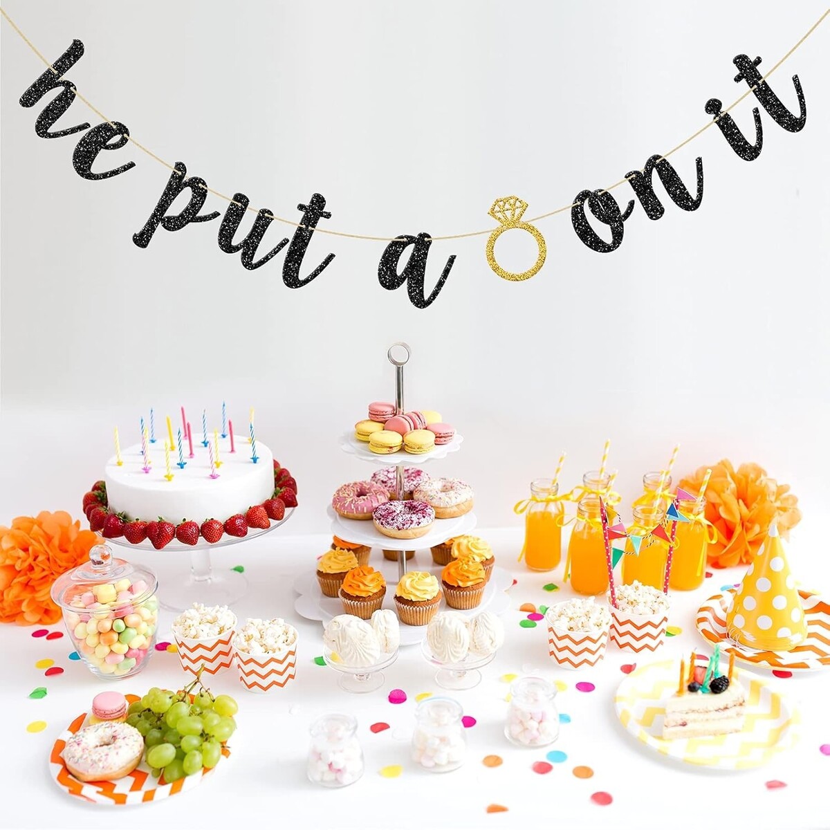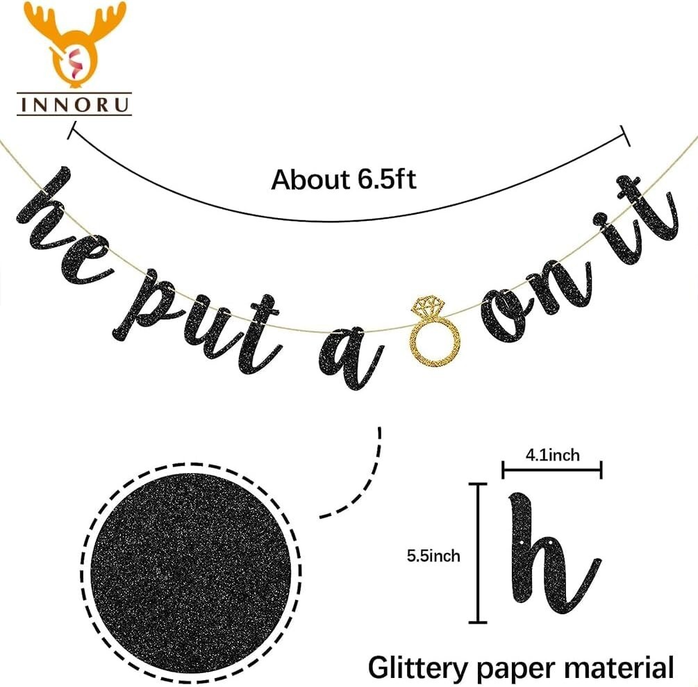 Your engagement is a precious moment, and this He Put A Ring On It Banner is the perfect way to commemorate it. The sparkling black glitter font against the shimmering gold accents makes for a breathtaking visual display that showcases your engagement joy. Easy to assemble and versatile for various settings, this banner is an essential addition to your cherished celebration.