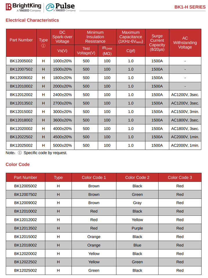 10Pcs BK12005002-P Brightking Axial Spark Gap 1kV 20% 1.5kA Surge Arrester THT
