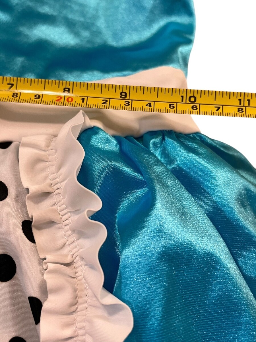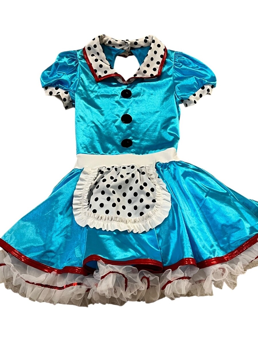 This vibrant dance costume features a shiny blue bodice, polka dot detailing, and a charming ruffled apron. Ideal for stage performances or themed events.