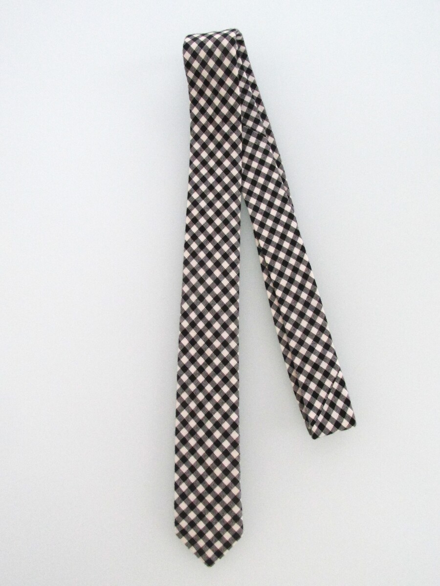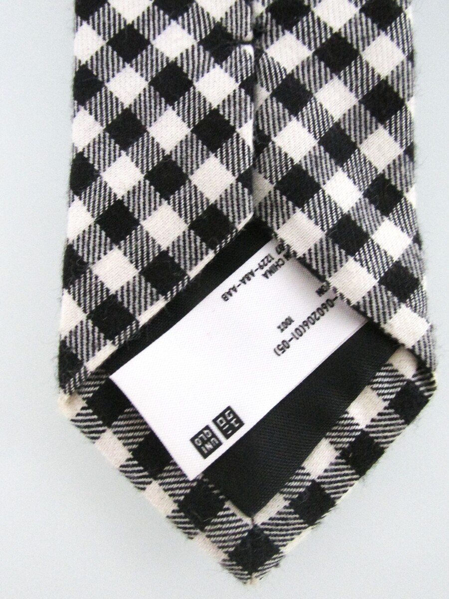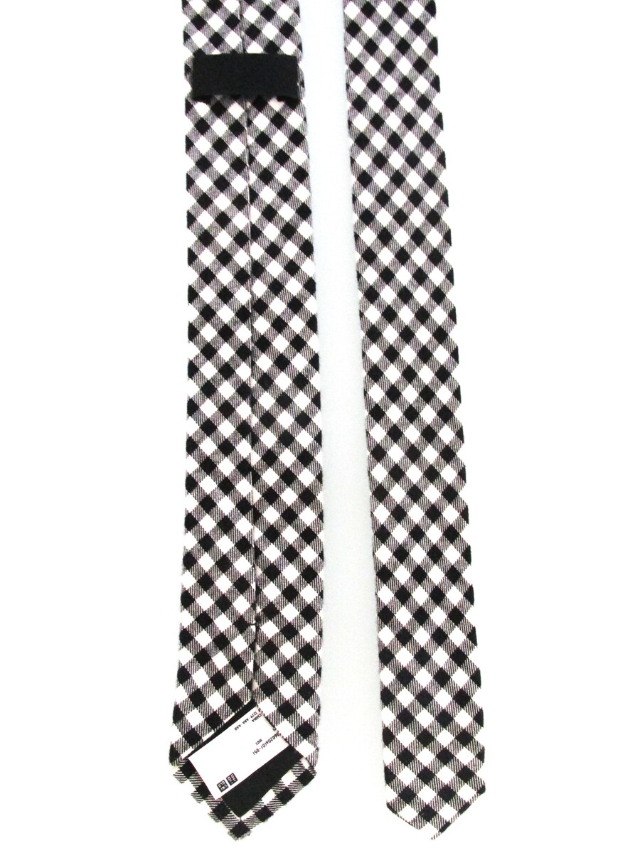 Description: Up for sale is a Uniqlo (NWOT) men's skinny cotton tie. The tie is handmade of 100% cotton. The tie has a gingham check pattern in black, white. The dimensions are approximately 58" long x 1.90" wide.