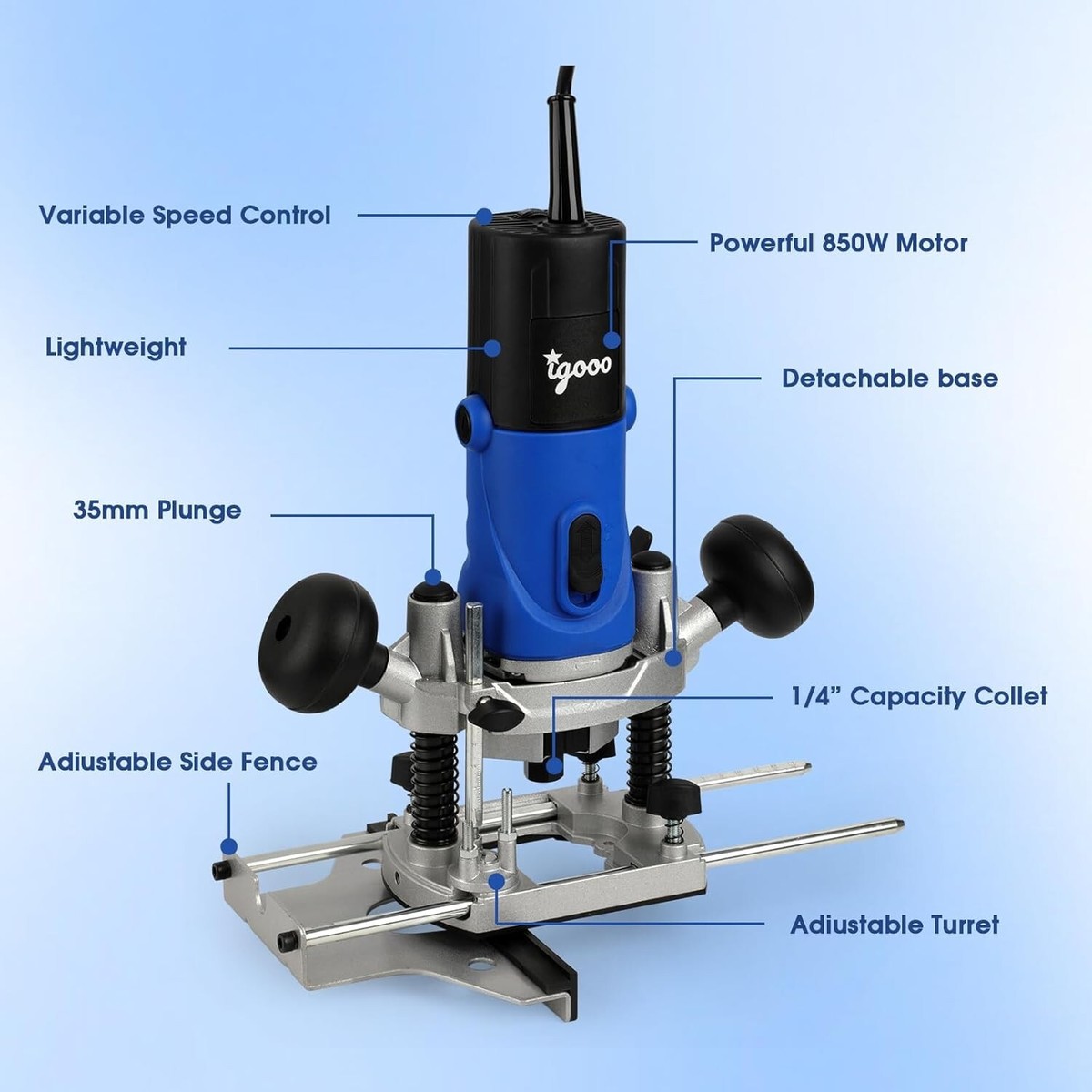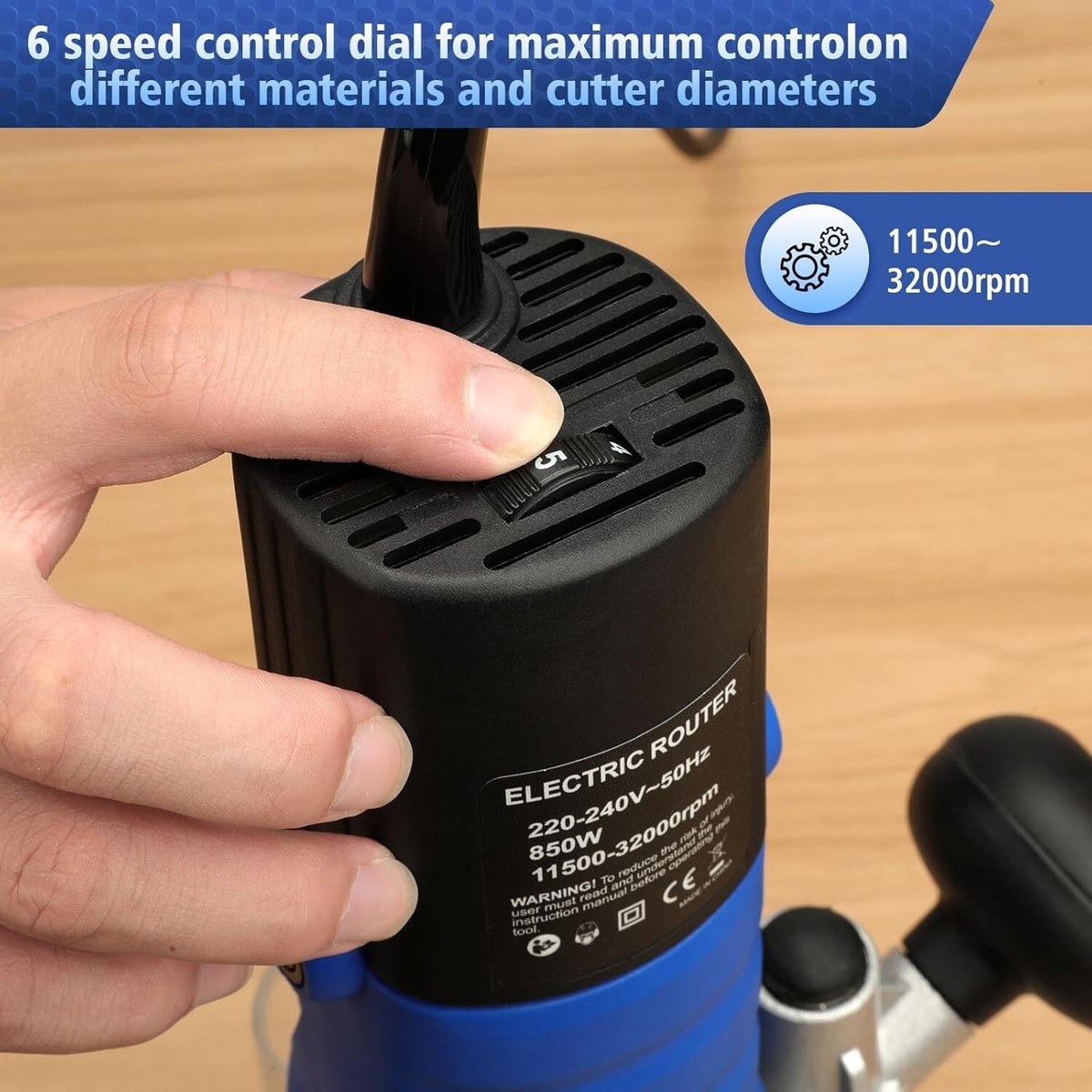 AC Electric Plunge Woodworking Router Kit, 6 Variable Speed, Soft Start Motor, with Edge Guide, 1/4?, 6mm and 8mm Collets, 6 bits, Vacuum Adaptor, 120V 60Hz 850W Model ER850