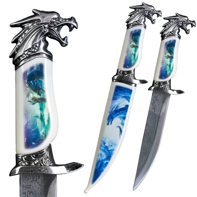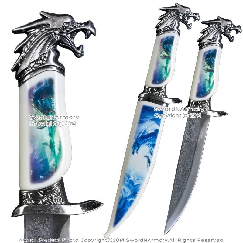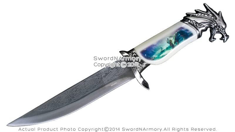 This is the Fantasy Dragon Dagger w/ Scabbard. The blade of the dagger has been constructed from 440 Stainless Steel. An acid etched design decorates the top of the dagger. The scabbard features a beautifully colored picture of a dragon flying in the sky. [Dimensions] Overall Length: 13.5" Blade Length: 7" Hilt Length: 5.5" [Blade] The blade of the dagger has been constructed from 440 Stainless Steel. An acid etched design decorates the top of the dagger. The dagger comes sharpened. [Scabbard] The scabbard features a beautifully colored picture of a dragon flying in the sky. [Handle] The handle features the same image as the scabbard. The pommel of the dagger is dragons head. [Quality] All of our products are made of the finest materials, and are packaged securely in our own warehouse