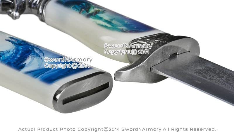 Product description: This is the Fantasy Dragon Dagger w/ Scabbard. The blade of the dagger has been constructed from 440 Stainless Steel. An acid etched design decorates the top of the dagger. The scabbard features a beautifully colored picture of a dragon flying in the sky. [Dimensions] Overall Length: 13.5" Blade Length: 7" Hilt Length: 5.5" [Blade] The blade of the dagger has been constructed from 440 Stainless Steel. An acid etched design decorates the top of the dagger. The dagger comes sharpened. [Scabbard] The scabbard features a beautifully colored picture of a dragon flying in the sky. [Handle] The handle features the same image as the scabbard. The pommel of the dagger is dragons head. [Quality] All of our products are made of the finest materials, and are packaged securely in our own warehouse