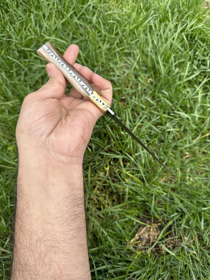 Blade of this knife has a nice file work and is made of 512 layers of 4340 stainless steel and 1075 high carbon steel and hardness 55-58 HRC .