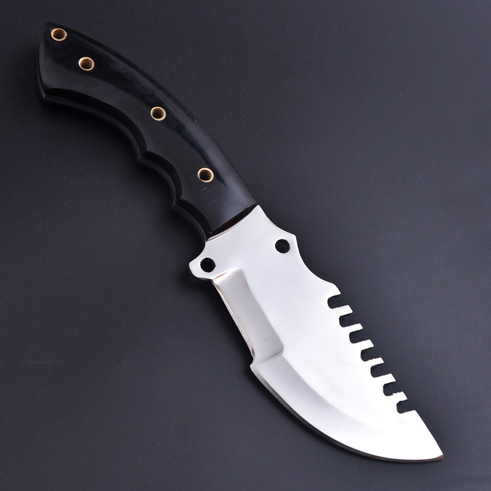 Carbon steel requires regular maintenance to prevent surface oxidation. Keep blade dry, wipe with a light oil after use, and store in dry conditions. Leather sheath should be conditioned periodically to maintain suppleness.