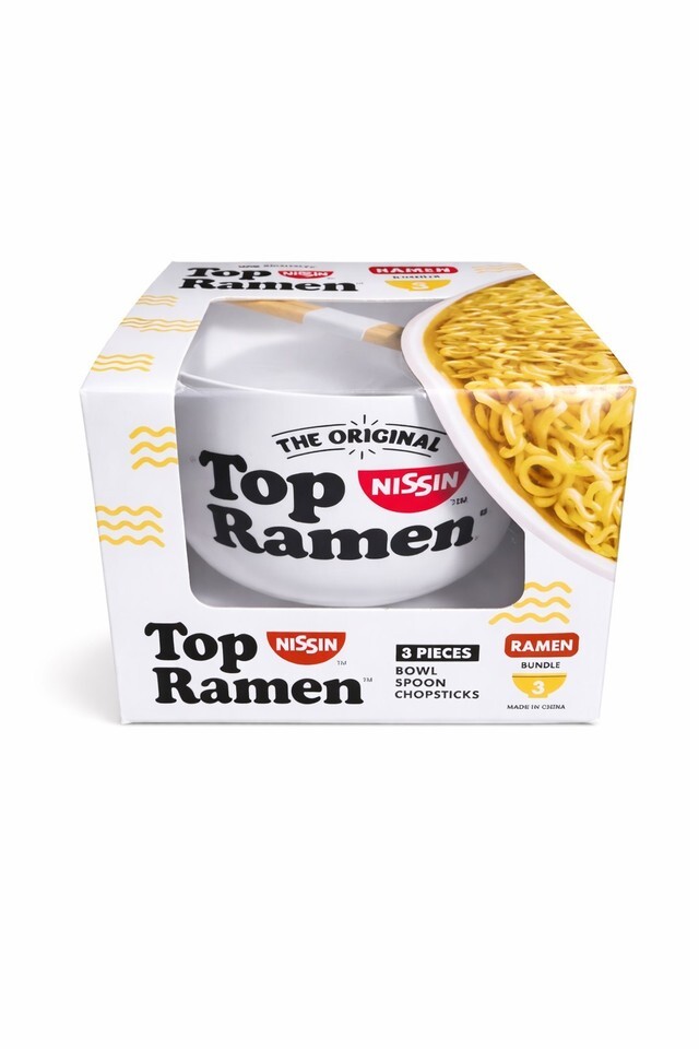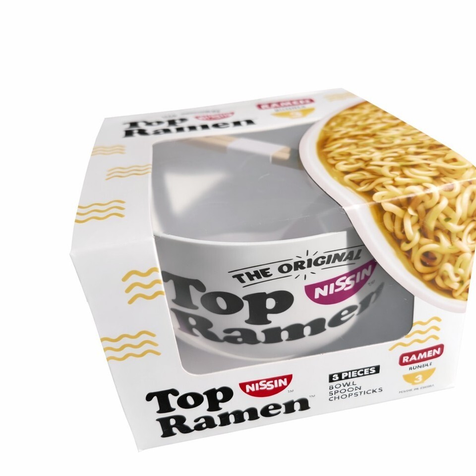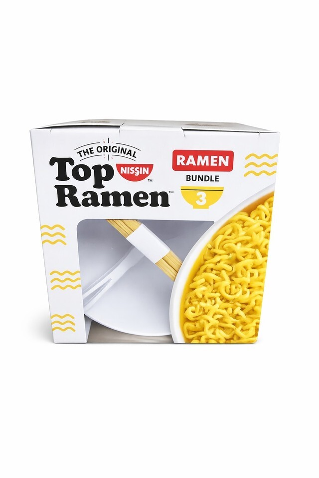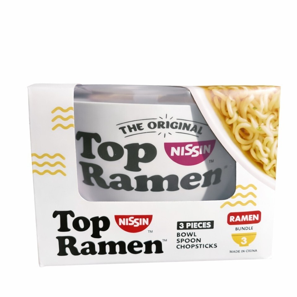The Top Ramen Bowl Set is a brand new three-piece gift bundle that includes a noodle bowl, soup spoon, and chopsticks. Made of white plastic with a solid pattern, this round bowl set is perfect for enjoying your favorite ramen dishes. The set is themed around food and drink, making it a practical and stylish addition to any kitchen or dining room.