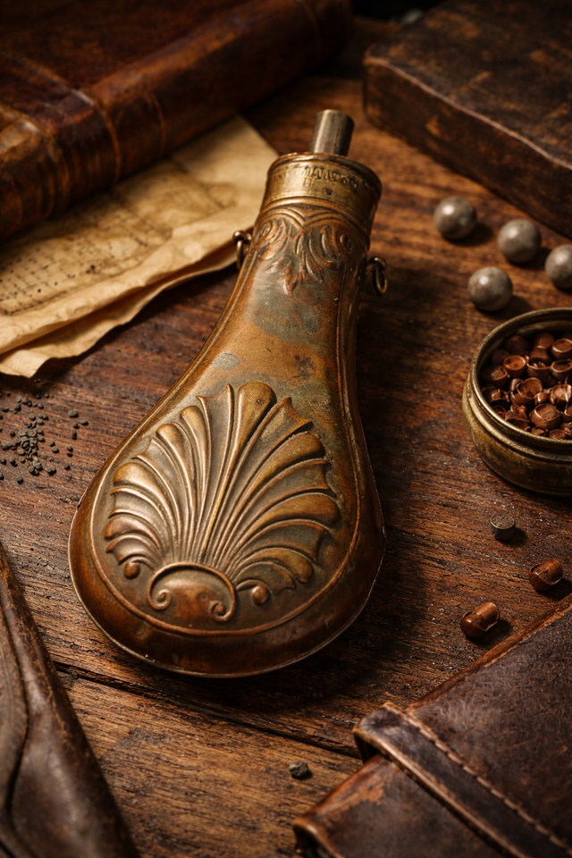 A strong example of an authentic American-made powder flask, suitable for collectors of early American antiques, historical objects, or 19th-century metalwork.