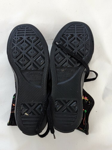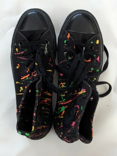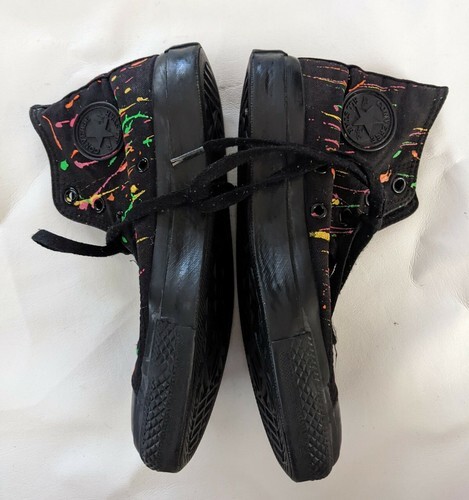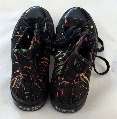 A vendre, une paire de Converse d'occasion Mandrin Chaussure Taylor All Star Noir Rose Fluo Peinture Splatter Femme 6 Homme 4
